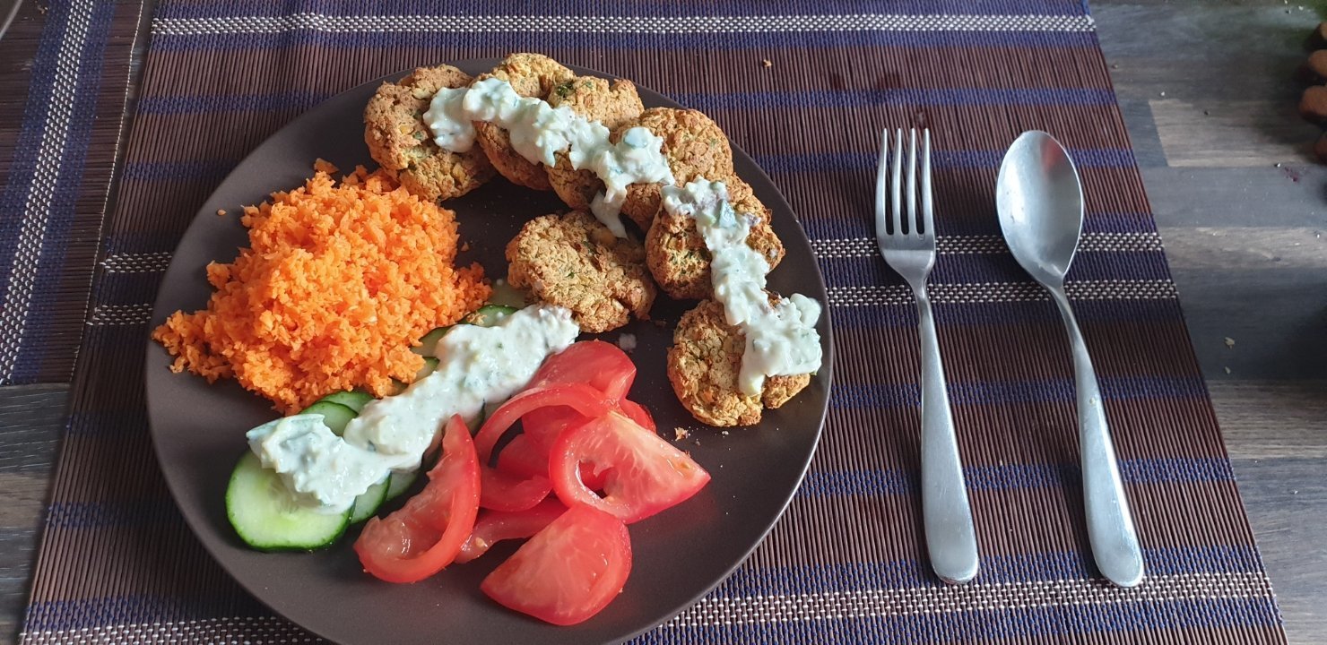 Je prends pas souvent de photo de mes repasHier midi j'ai fait des falafels, crudités et tzatziki (set de table degueu no jugement svp