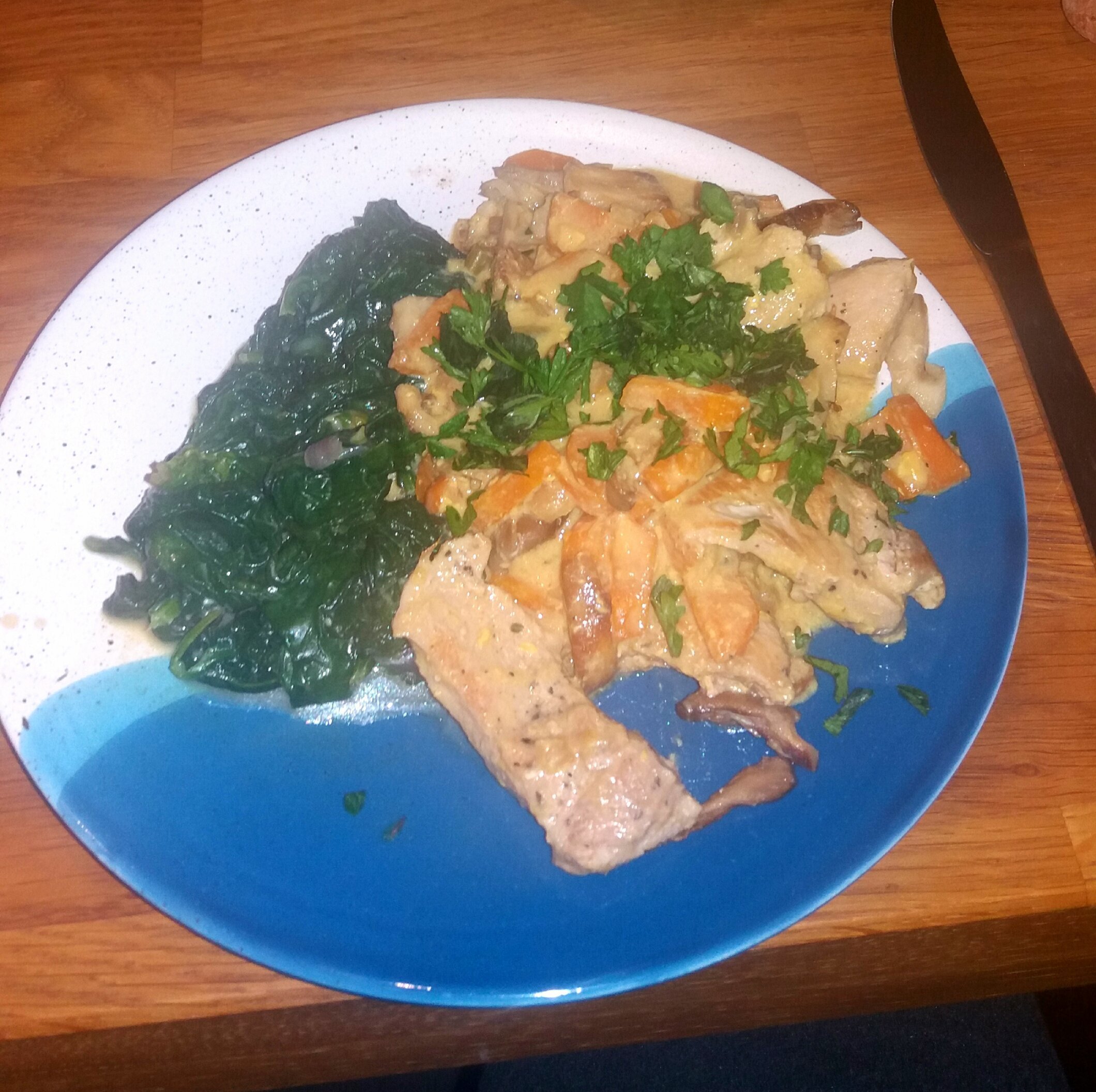 Franchement c'était délicieux. J'ai mis un jaune d'oeuf dedans comme une blanquette classique mais sans le roux. Pour une recette super light c'était vraiment top. C'est du skyr dans les épinards également.