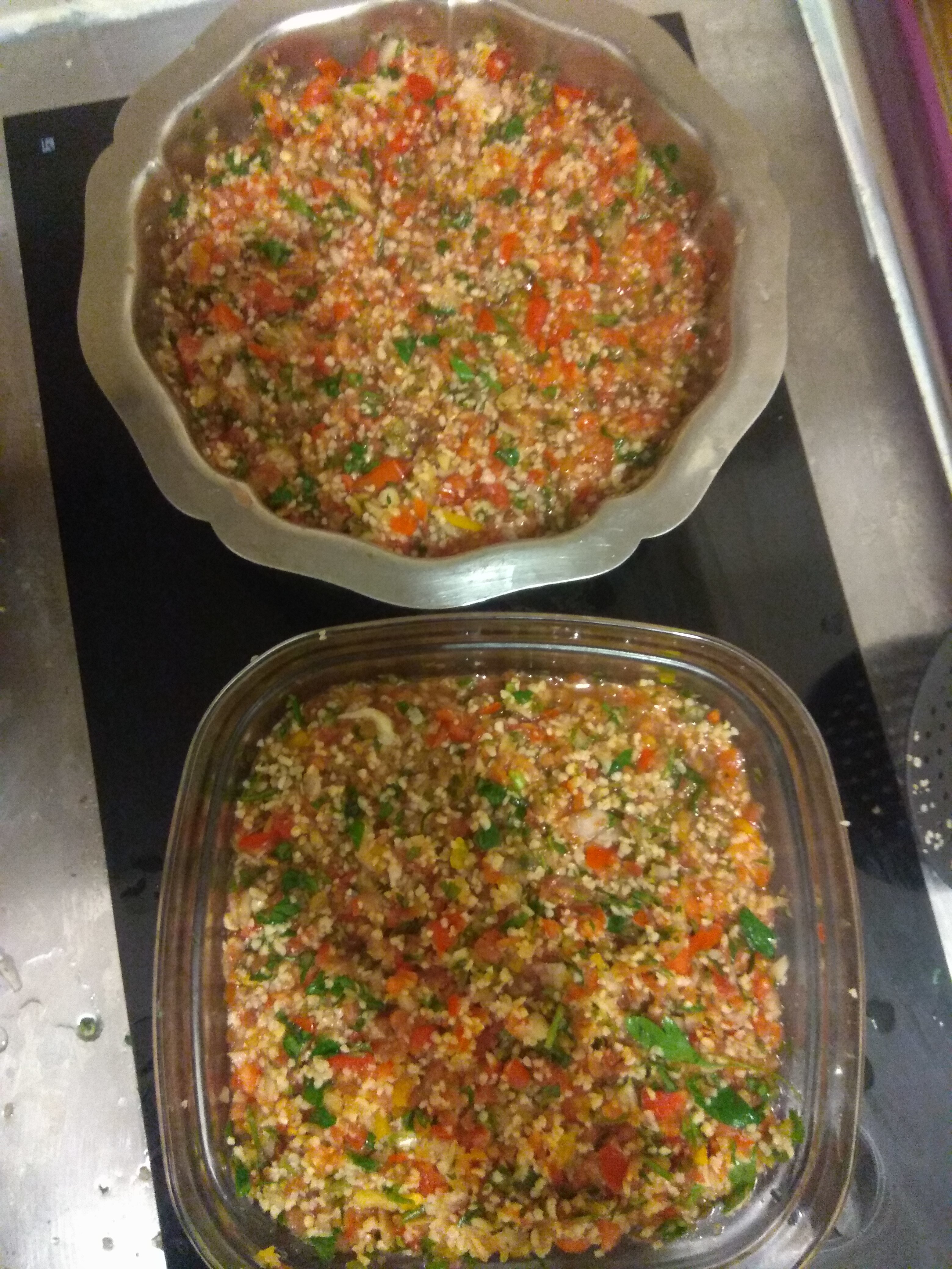 Essai de taboulé du jour (180g de boulgour trempé pendant 24h + 4 tomates, 2 poivrons, 2 oignons, 1 citron, 1 botte de persil + sel, huile d'olive etc)