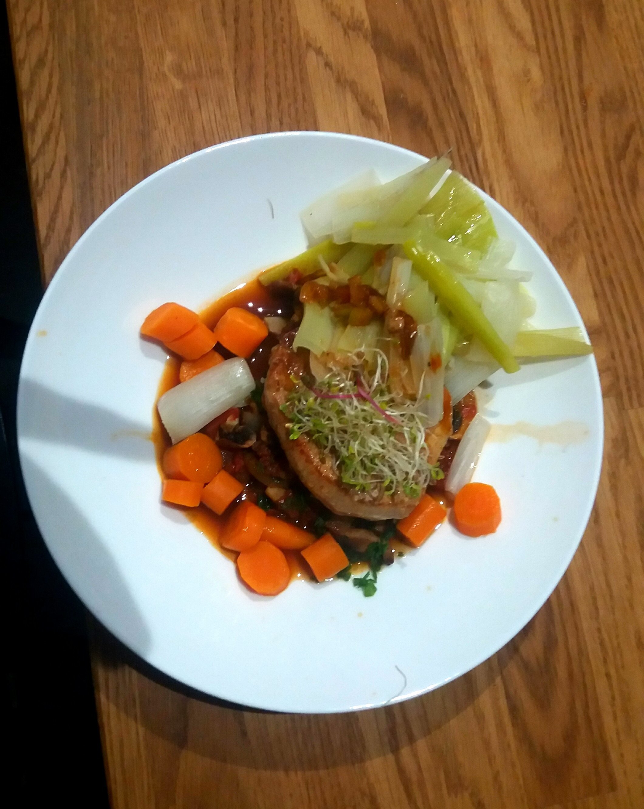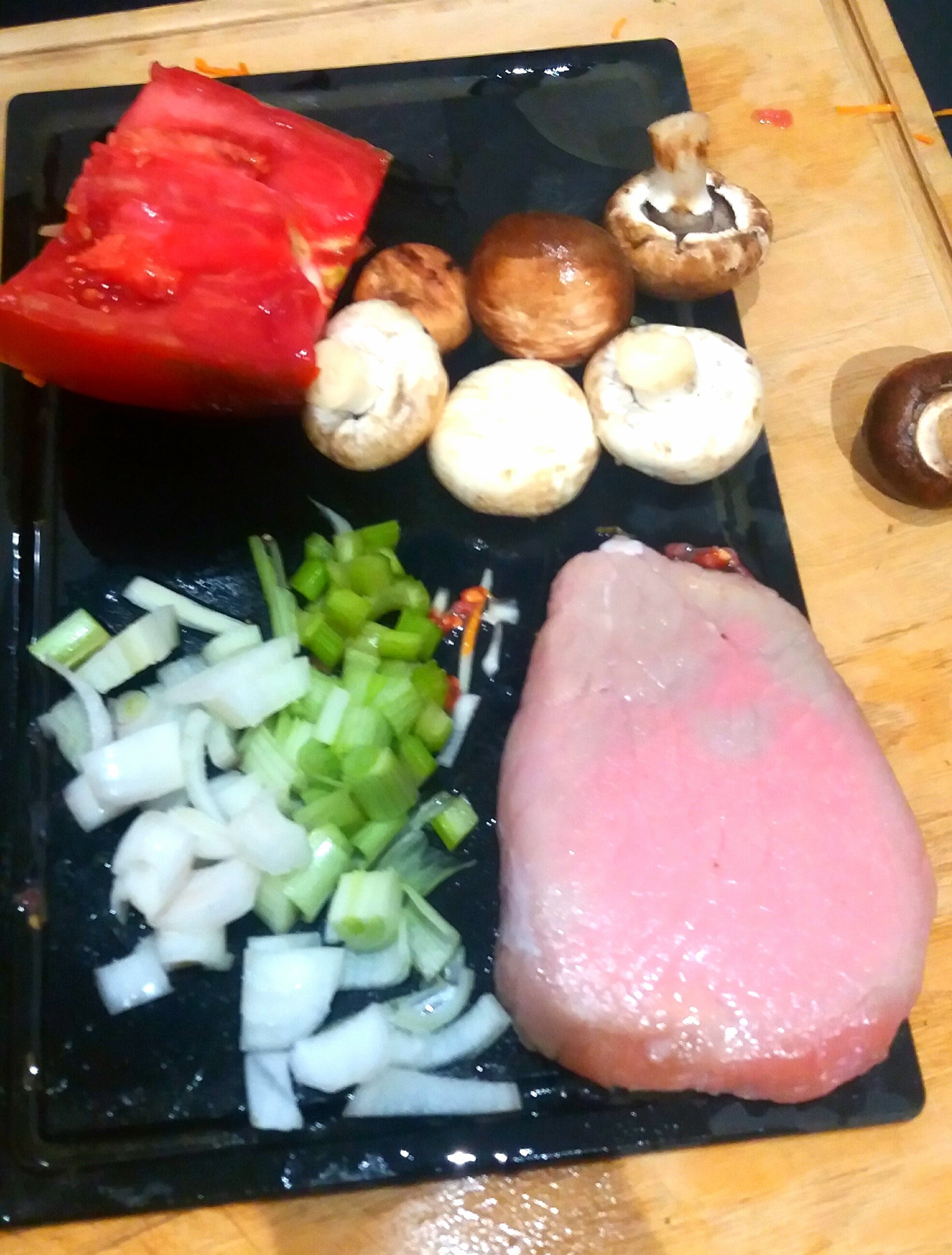 J'ai ensuite fais revenir ma garniture aromatique dans une poêle avec un fond de bouillon (céleri en des oignons) j'ai fais revenir le pavé de beau rapidement puis j'ai ajouté les champis en lamelles. J'ai ensuite ajouté le reste de tomate en cubes j'ai laissé revenir avec des herbes de Provence. Quand ca a compote j'ajoute le veau et je couvre. J'ajoute à la fin de l'ail et du persil.