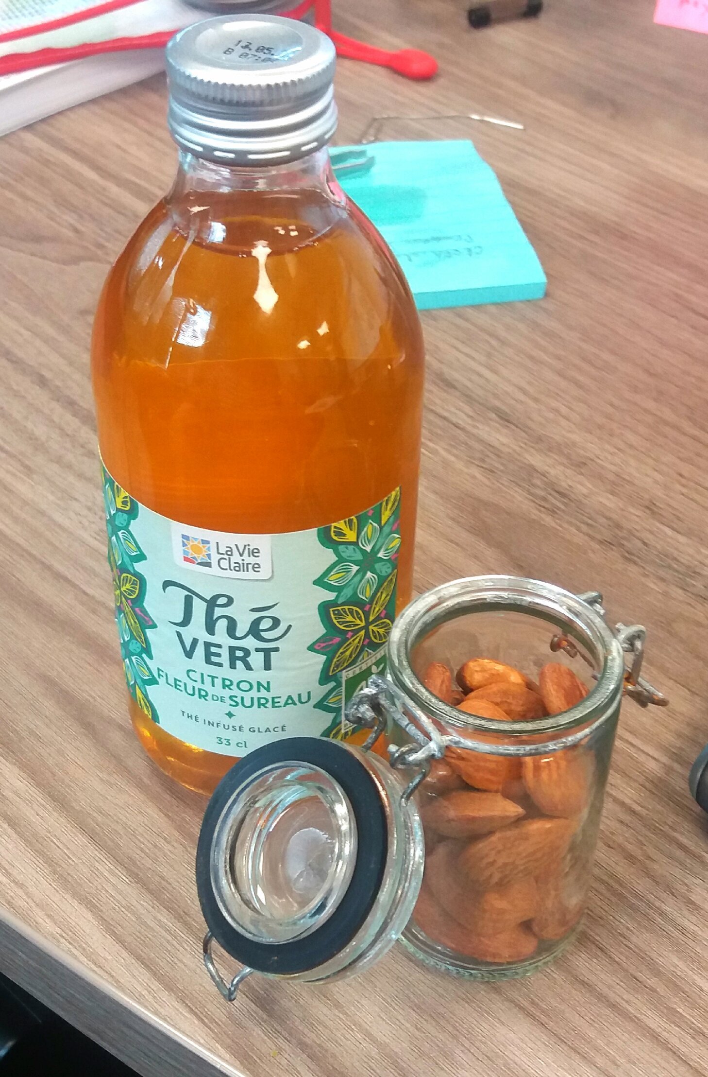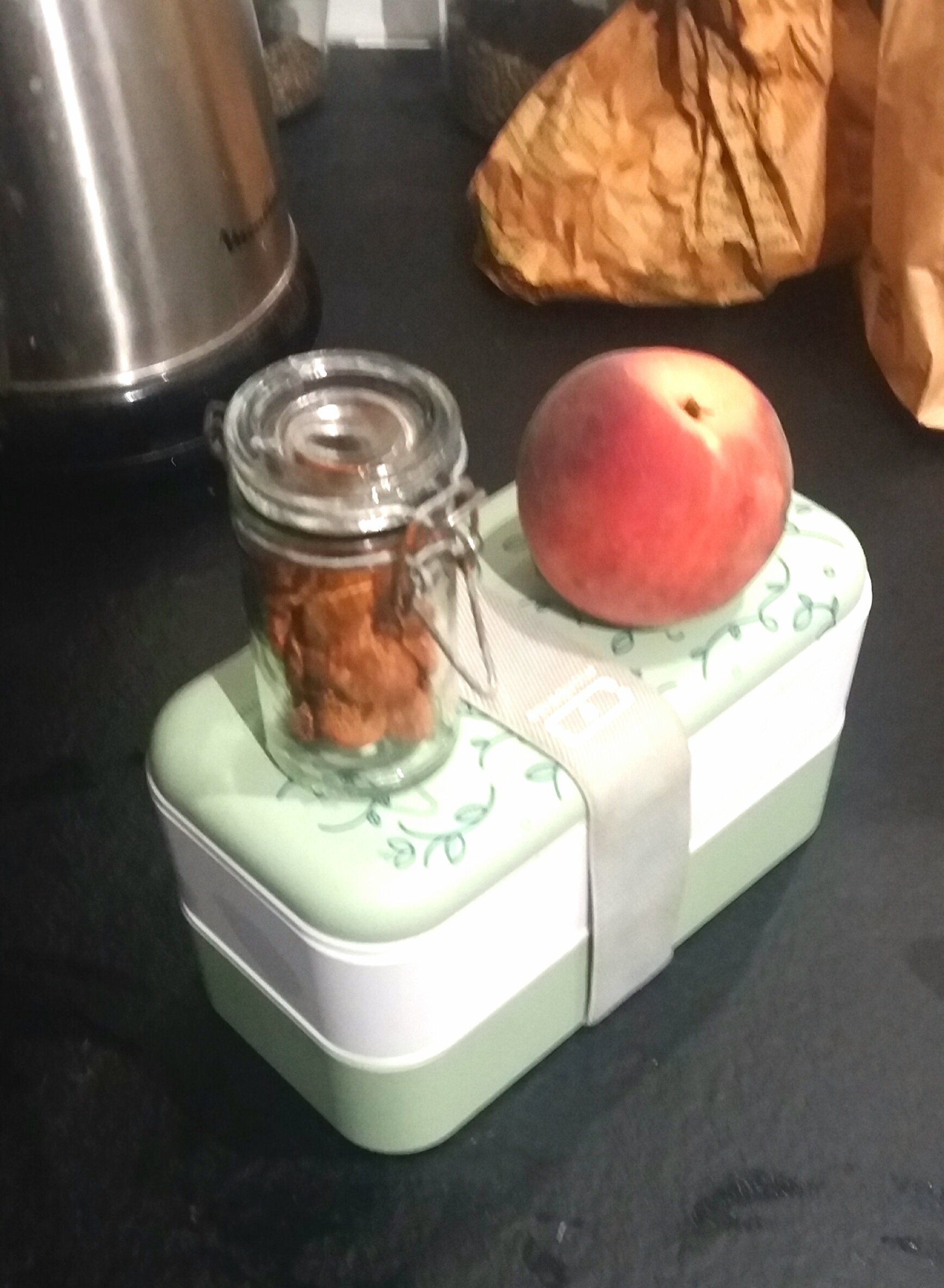 Soigneusement empacte avec une pêche et des amandes pour demain