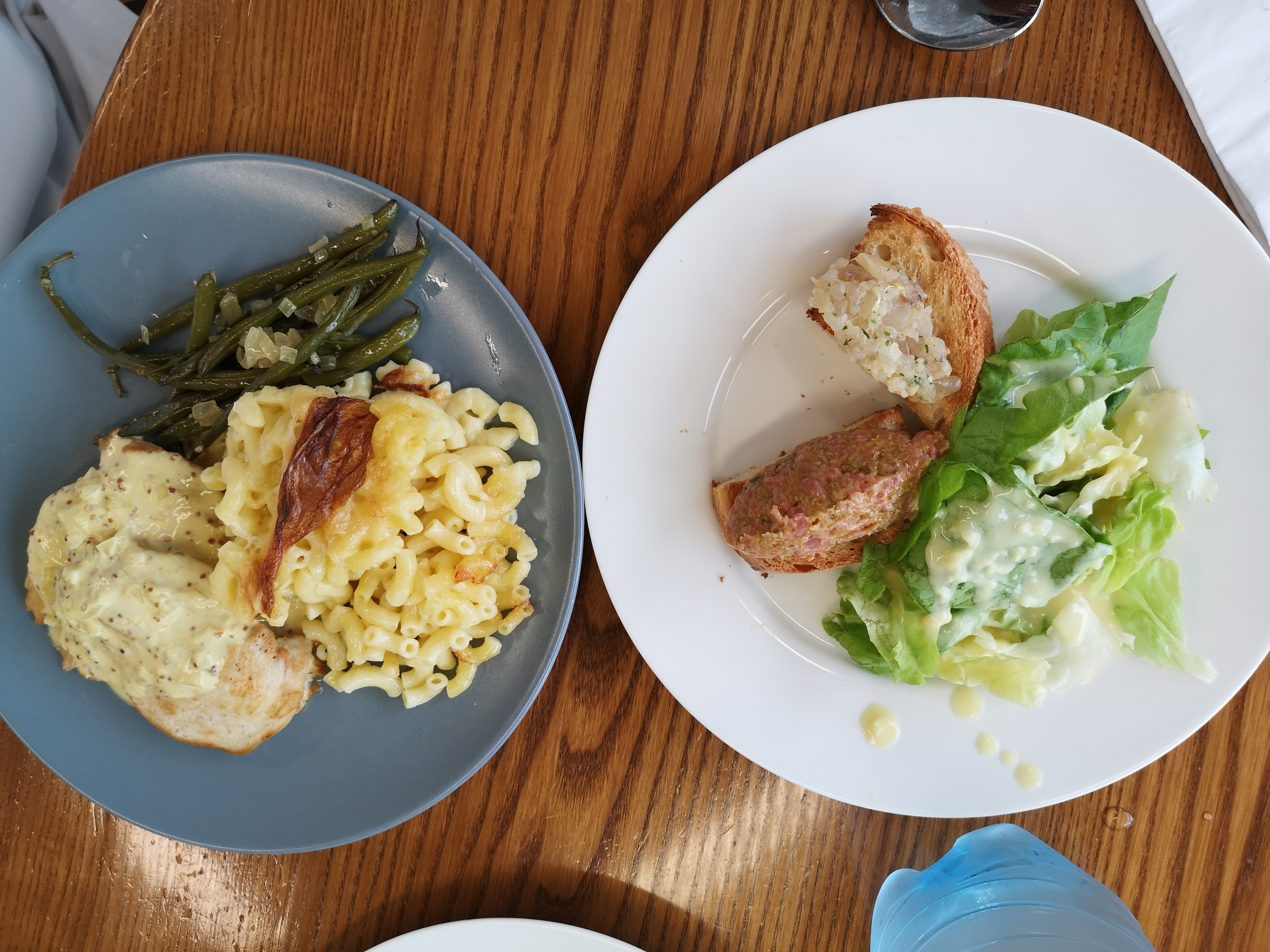 Et le menu de midi, tartare de poisson et de bœuf en entrée, esxalopine de poulet avec sauce moutardes à l'ancienne, haricots sautés et gratin de pâtes, bon appétit