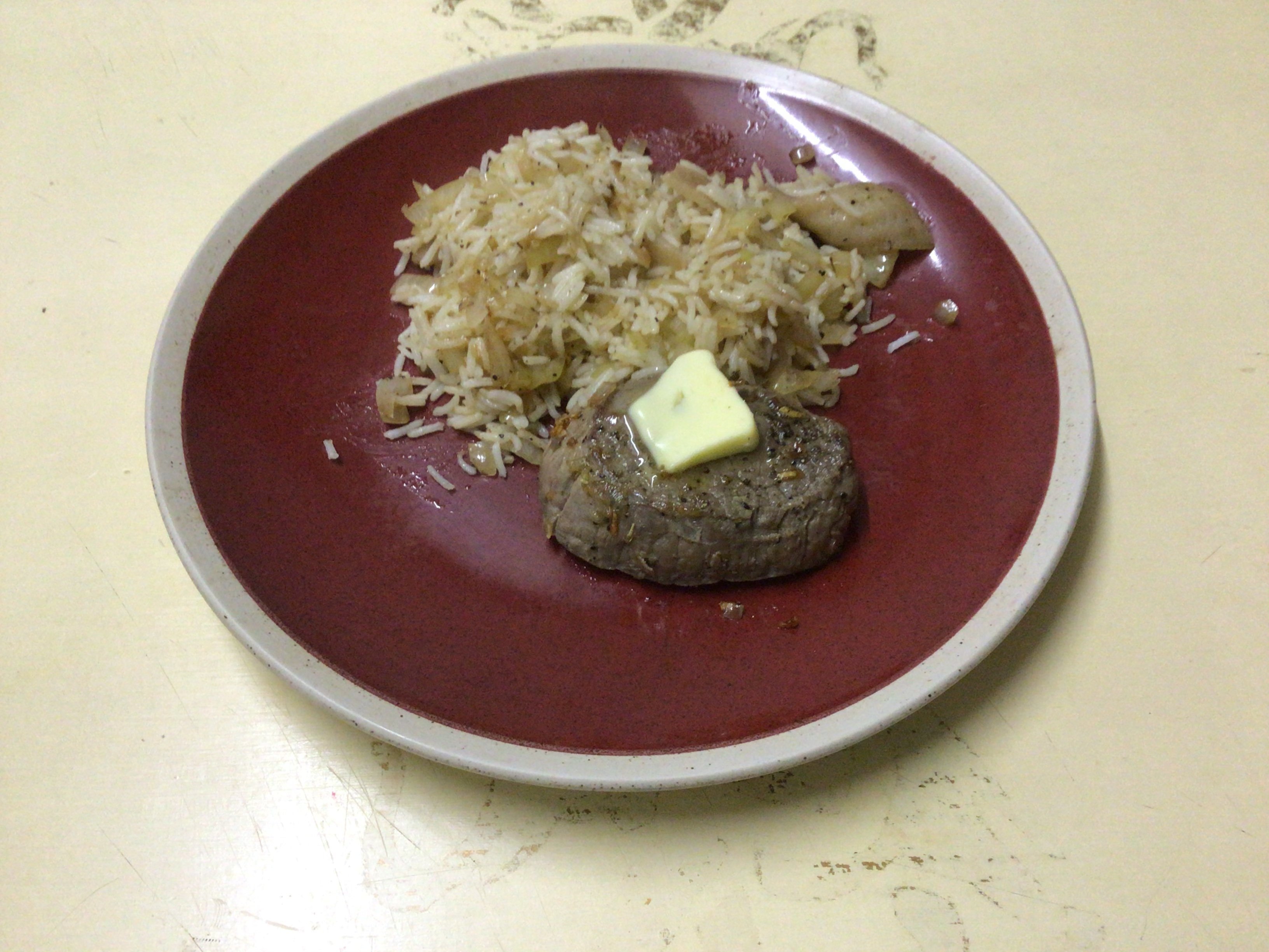 Rien d’extraordinaire, du tournedos aux des ognons et échalotes avec du riz ( et avec un peu de vinaigre de xérès)
