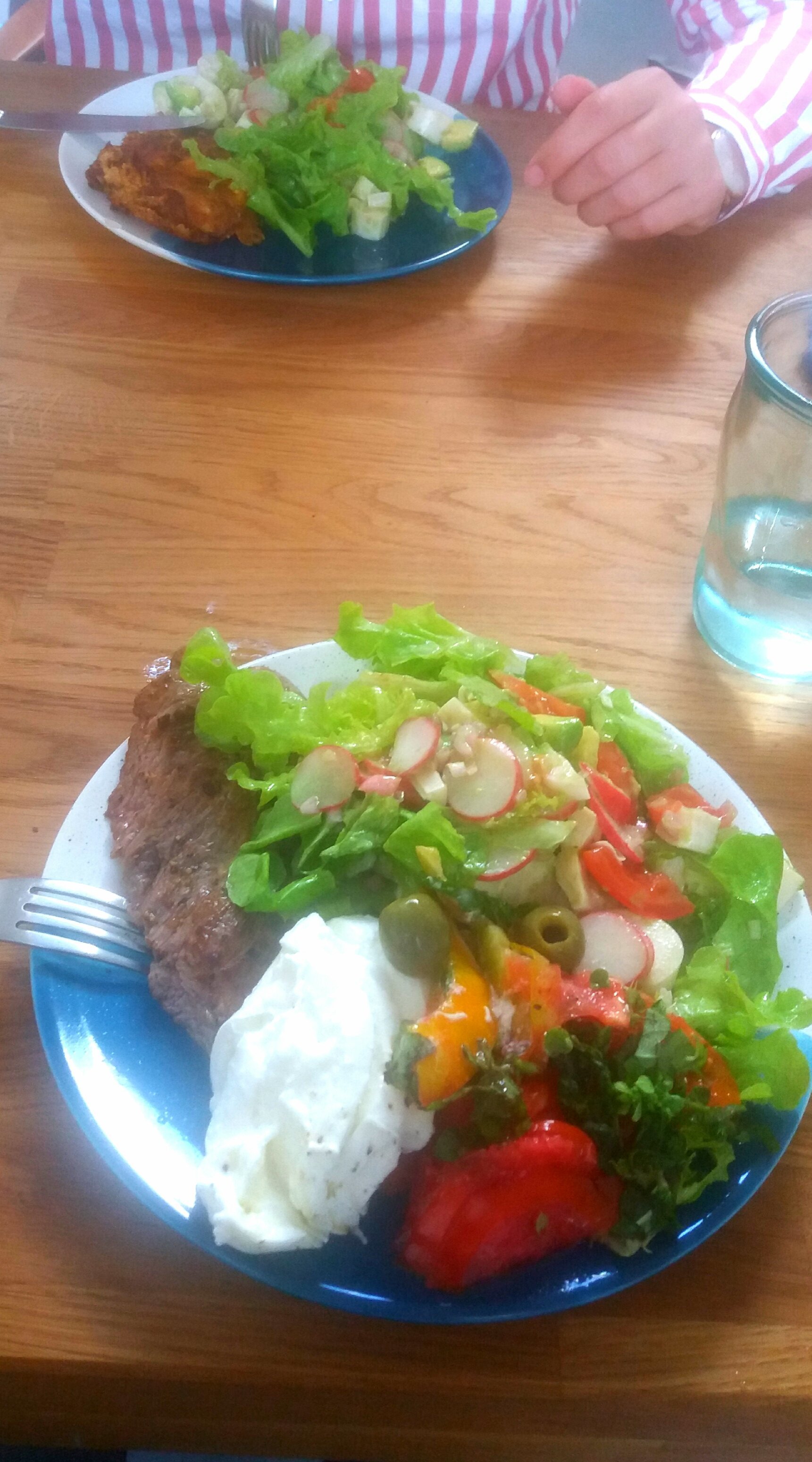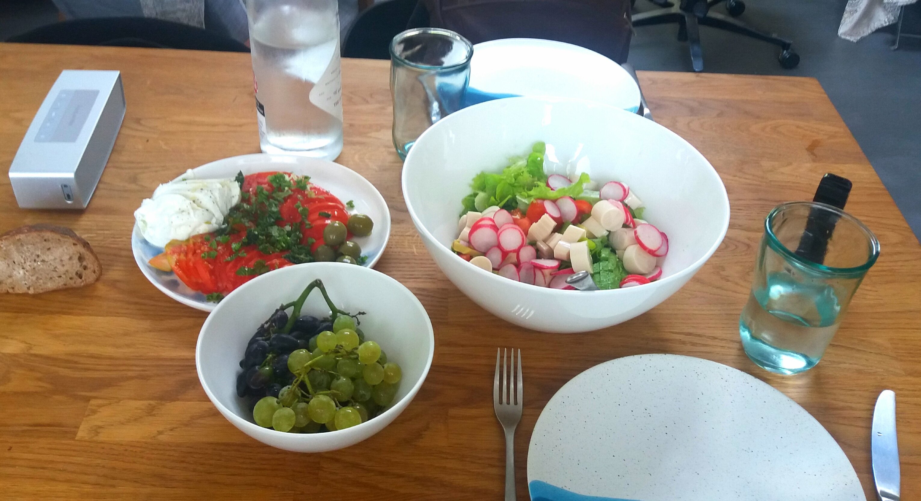 Tomates mozza basilic salade verte avec avocat radis et coeurs de palmier. Avec un bifteak pour moi. Et je prépare une galette tofu plus chiches pour ma copine. Raisin du jardin.