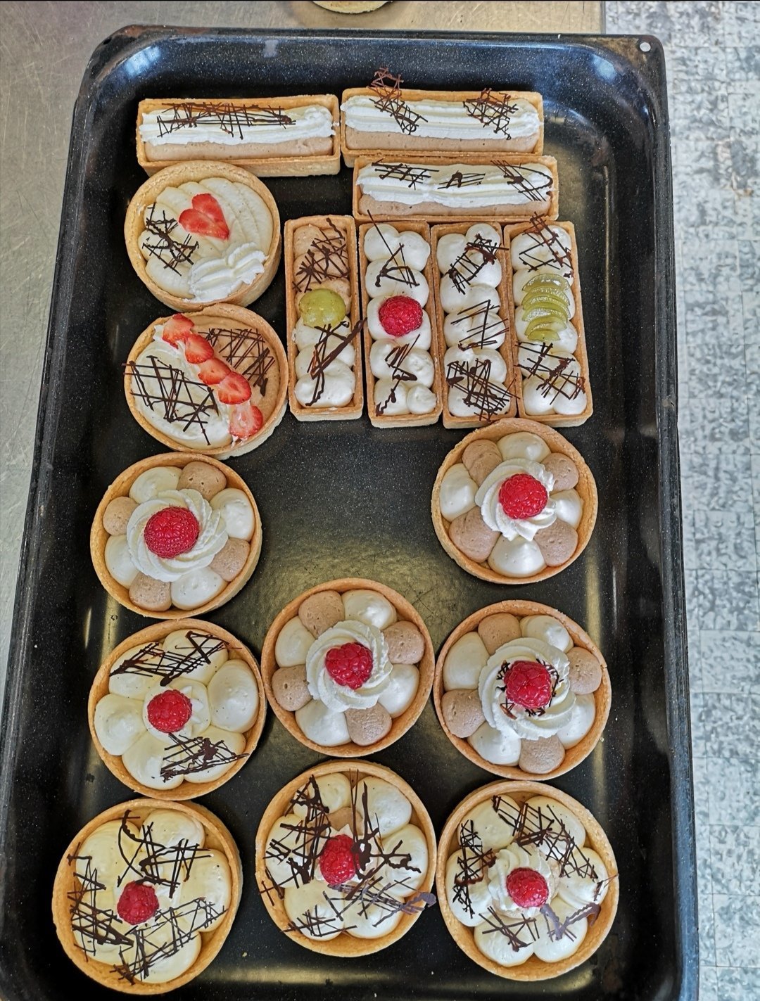 Menu du jour : Salade panaché (carotte, concombres, salade vert) avec purée de pomme de terre maison, tranche de porc avec sauce au poivre et brocolis aux amandes et en dessert bavarois bicolor (vanille et chocolat)
