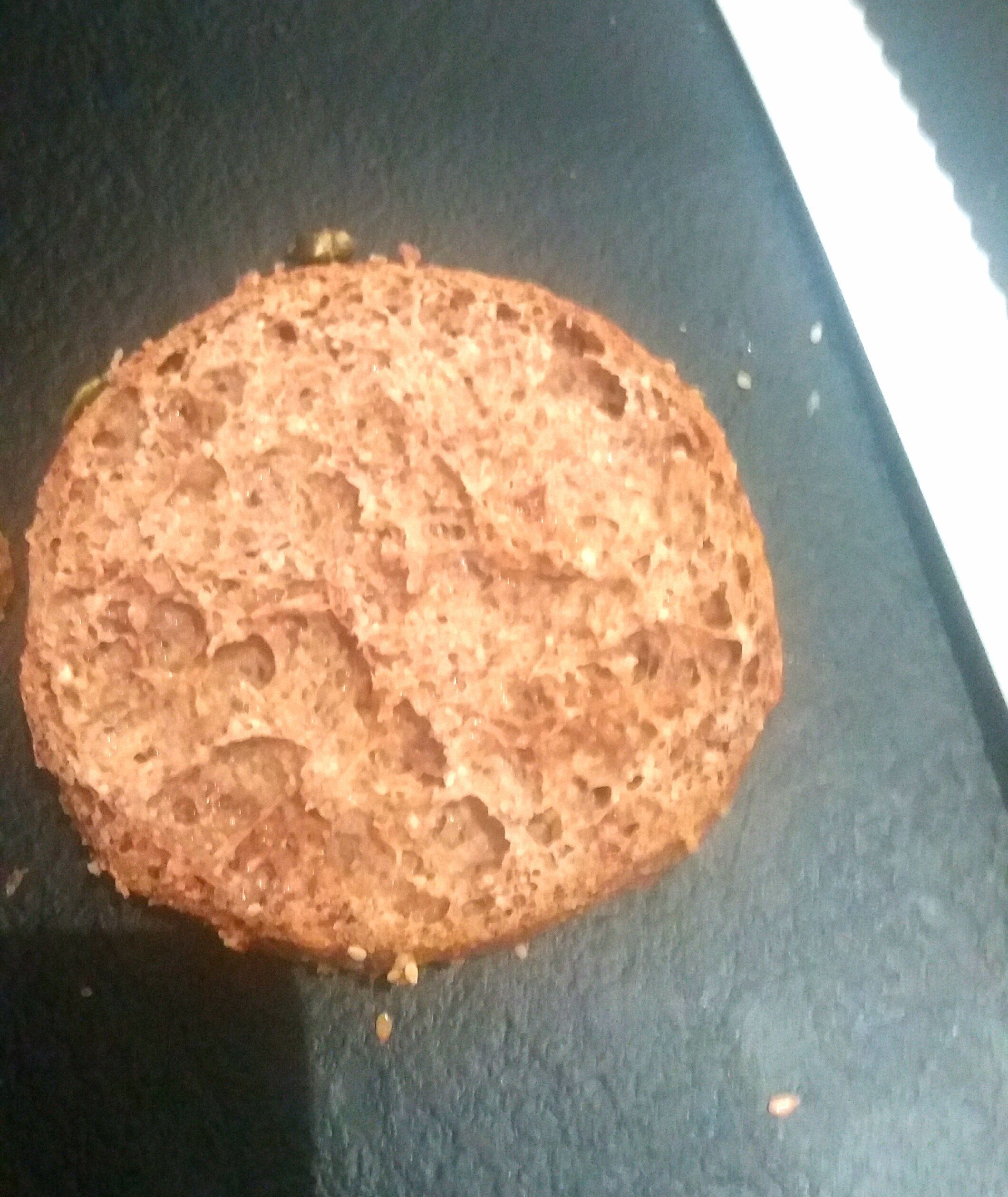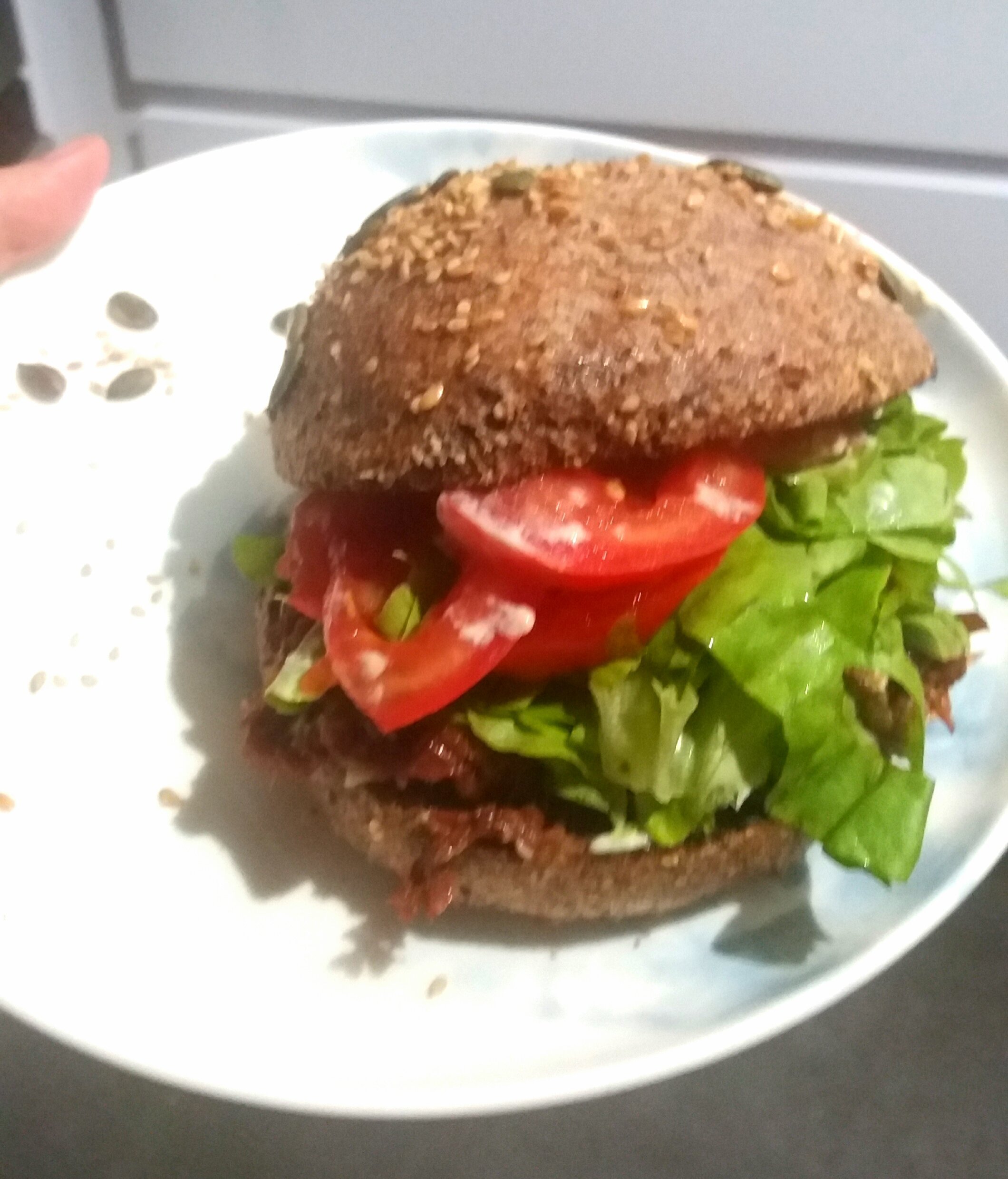 J'ai juste croqué dedans car je n'avais plus faim mais c'était pas mal. Il faudra que les pains soient moins humides la prochaine fois. Ca fait bien le job pour un truc végétarien dans gras et dans glucides. Après ca vaut pas un bon burger classique mais je suis satisfaite du résultat et ma copine s'est régalé
