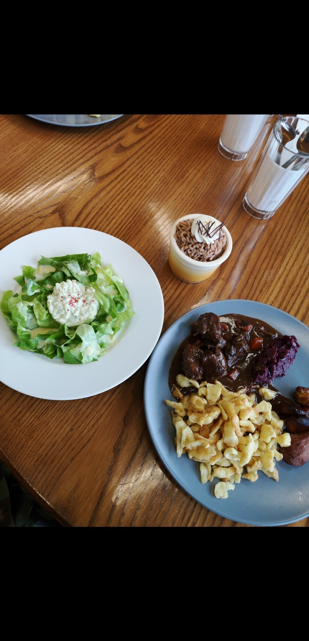 Menu du jour : chasse !Tartare de concombres et salade verte, Civet de cerf, Spätzlis maison, choux rouge braisé, marrons glacés, poire au vin rouge et vermicelles aux marrons. Bon appétit