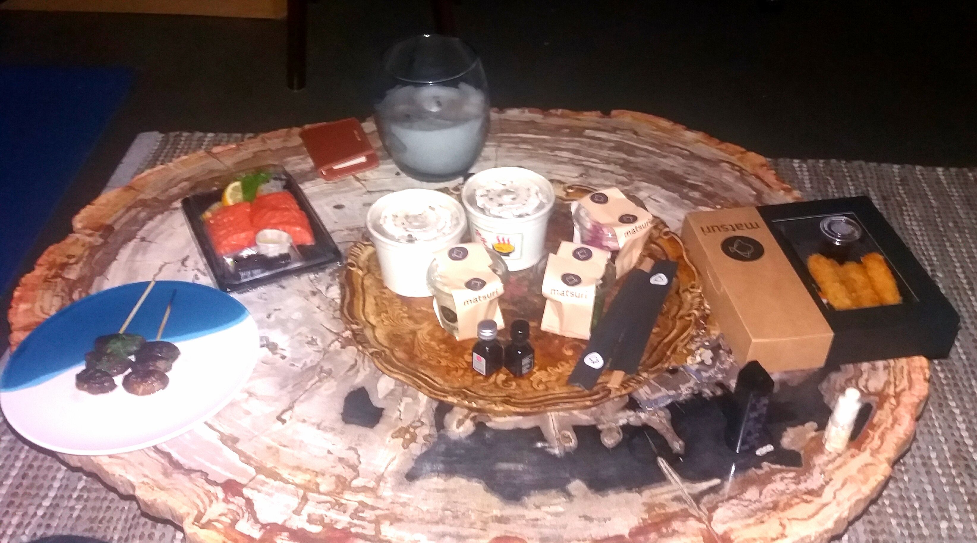 Ce soir c'est matsuri. J'ai pris juste des sashimis une salade de chou de la soupe et une petite brochette de champi. La copine les ebi fry (Elle mange du poisson parfois )