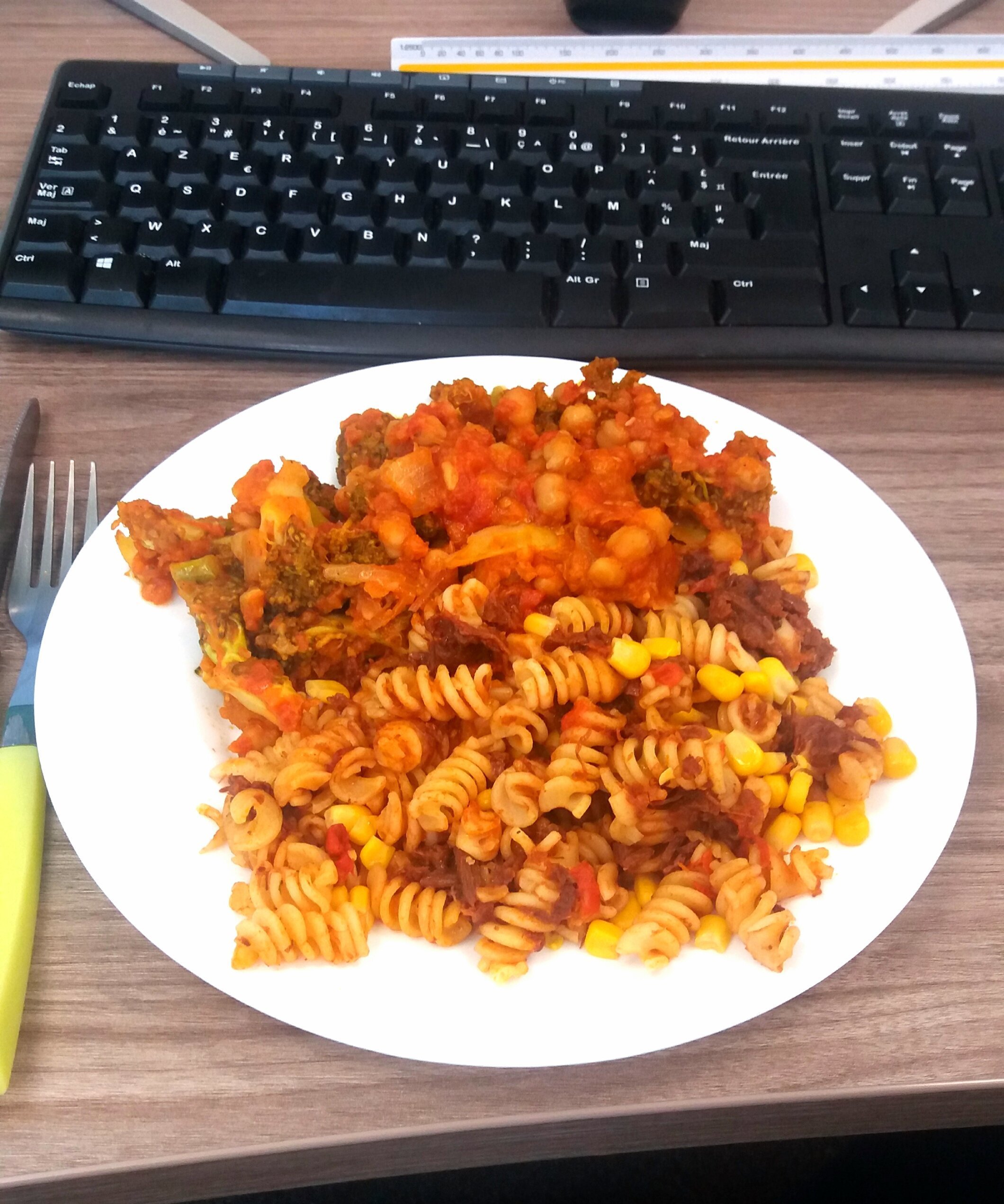 Au déjeuner de ce midi un repas préparé hier par ma copine car je suis rentrée tard du kung fu. Reste de pâtes avec brocolis trop cuit, sauce tomate mois chiches et oignons trop crus. Mais bon c'est fait avec amour.....
