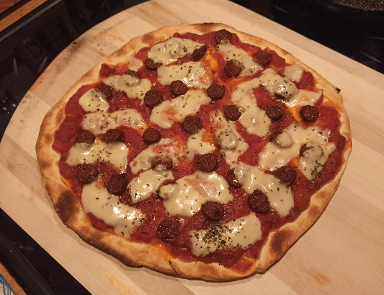 J'ai fait des pizzas pour ce soir, une à la merguez et l'autre au jambon cruMerci la pierre