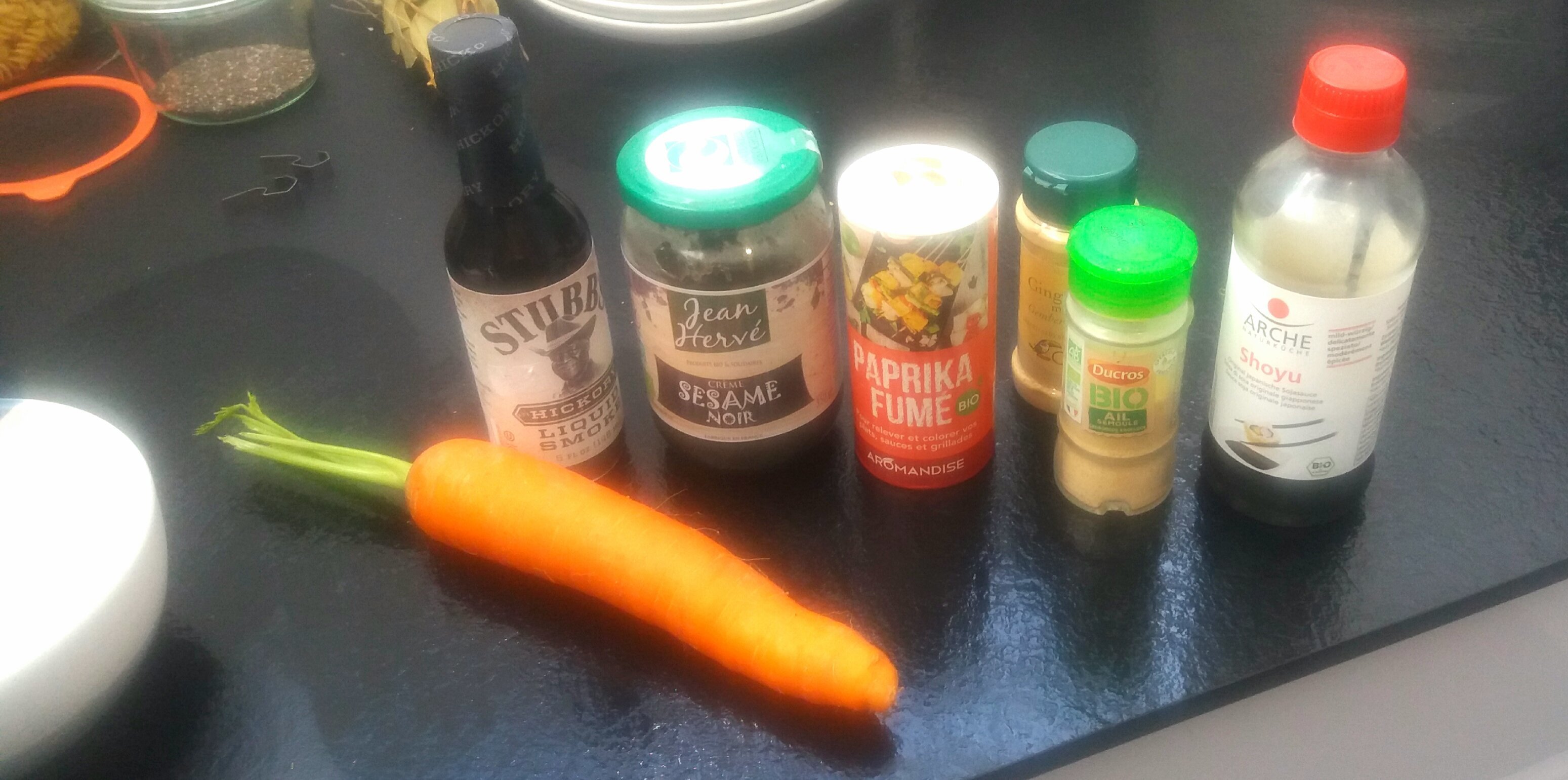 Pâte de sésame noir liquid smoke ail en poudre paprika fumé gingembre en poudre et soya.