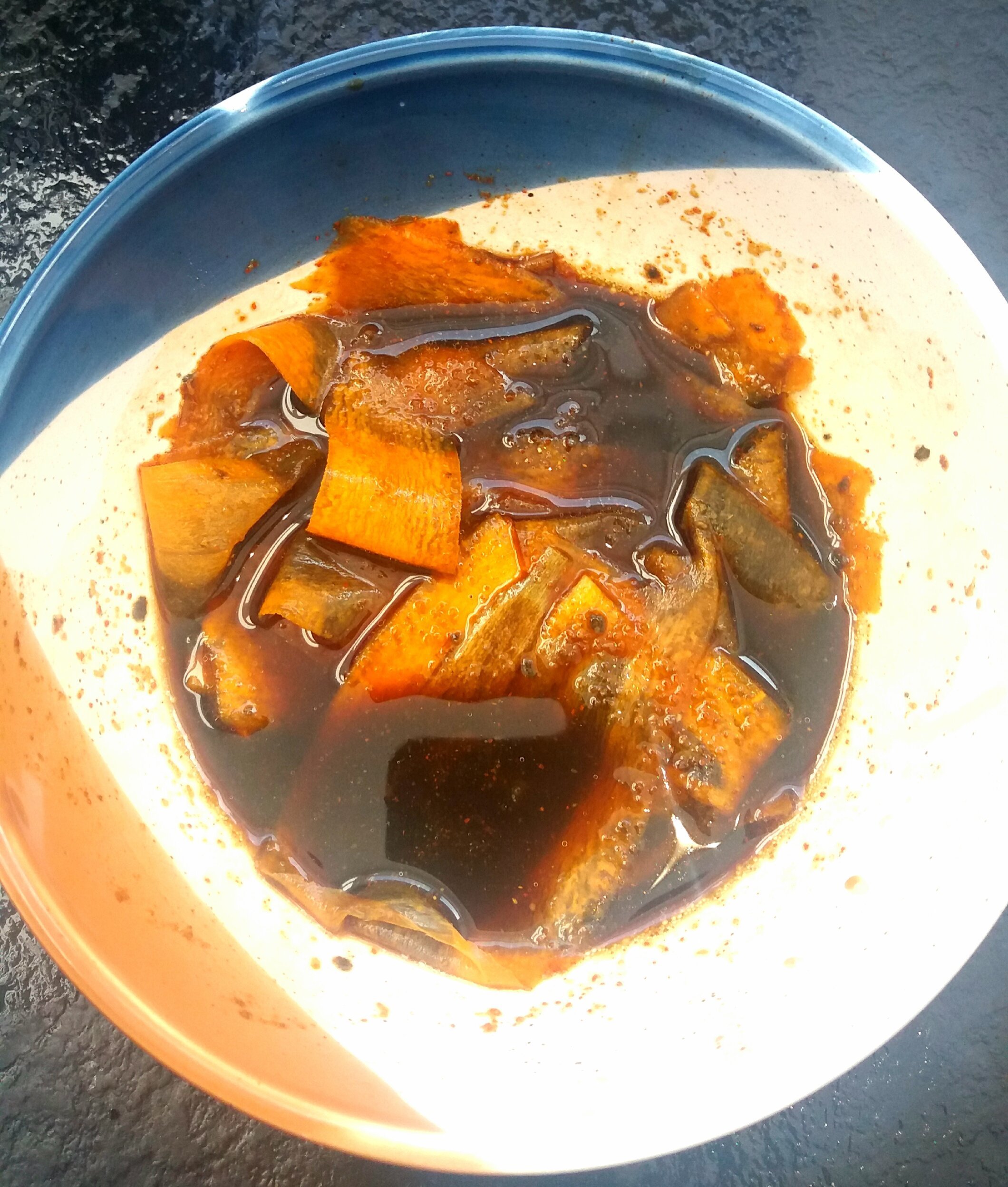 Du coup je vais éviter de mélanger proteines animales et glucides, Je me lance dans du faux bacon végétal à base de carotte pour accompagner mon plat