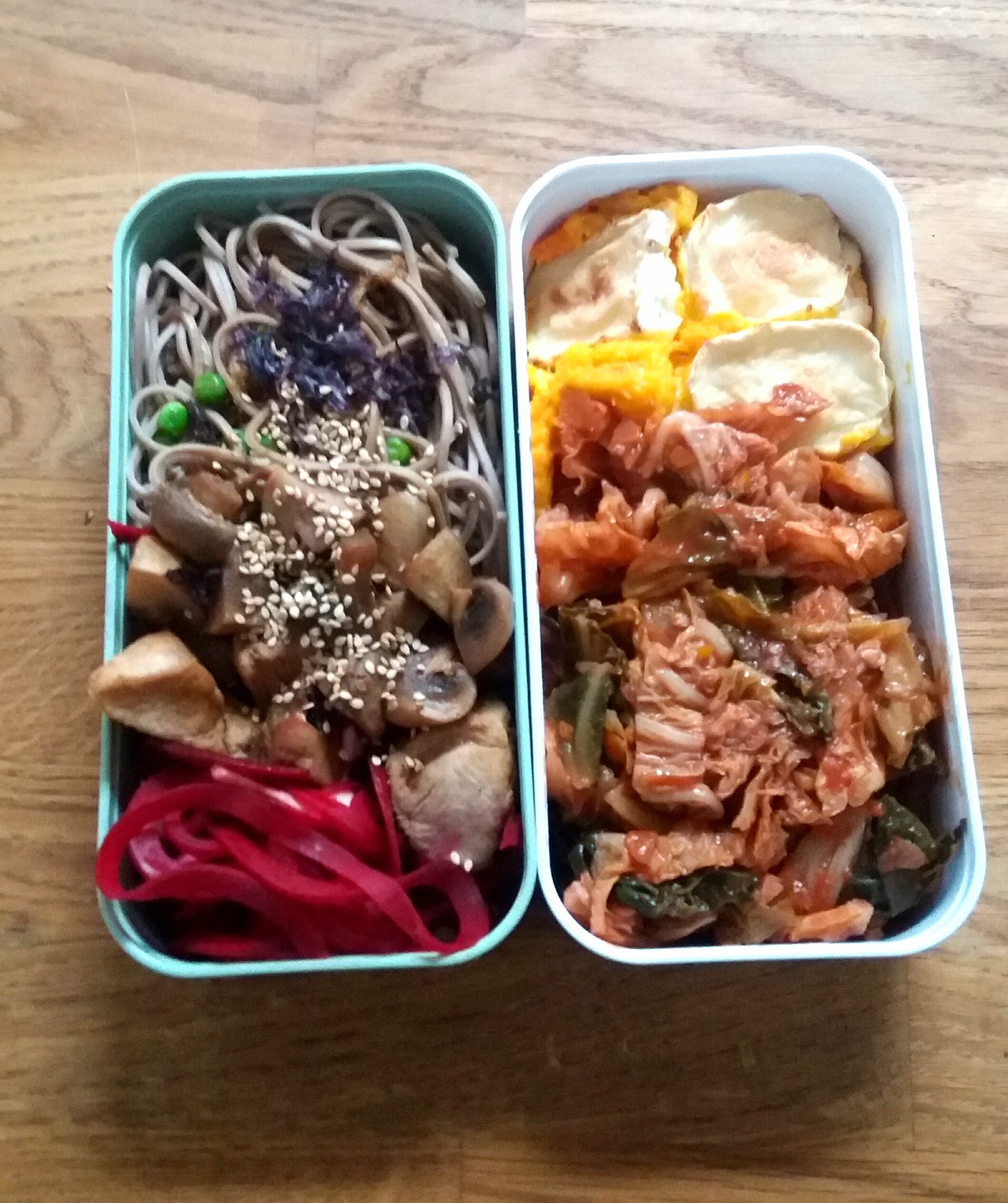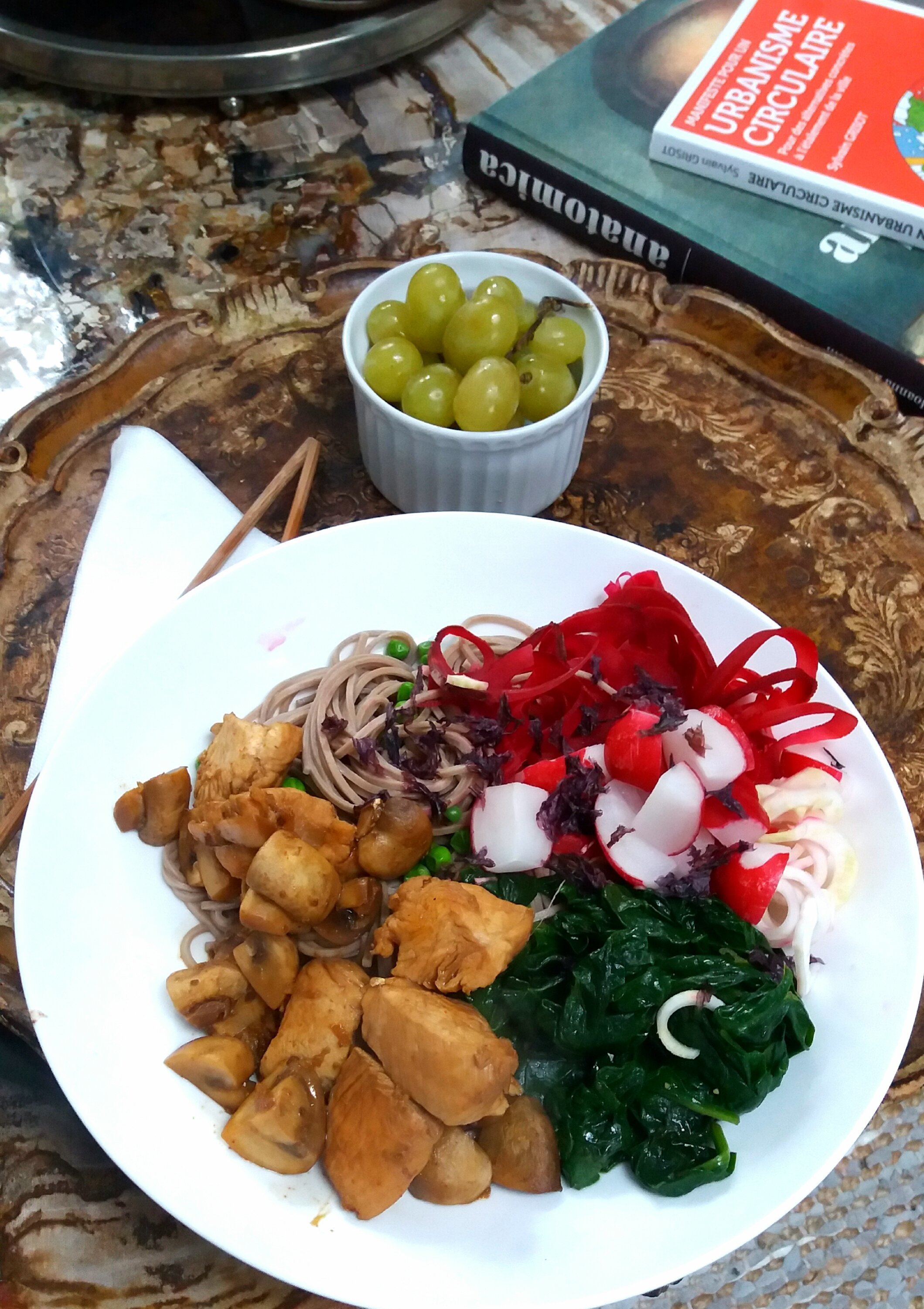 Des sobas aux petits pois, des de dinde sautee avec des champignons et une sauce huile de sésame soja ail gingembre miso noir, épinards frais, spaghettis de bettrave et céleri rave quelques radis, le tout saupoudré d'algues séchées violettes.