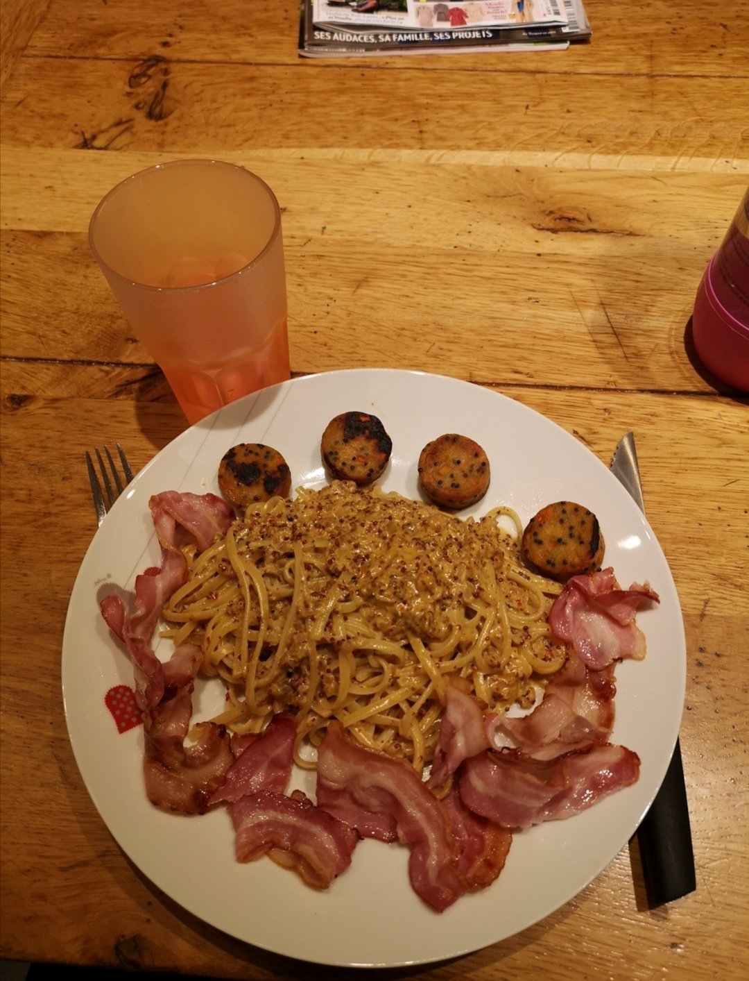soupe à la courge du jardin, et Tagliatelle avec une sauce à la crème /moutardes à l'ancienne / oignons /ail /bacon en petites tranches /champignons
