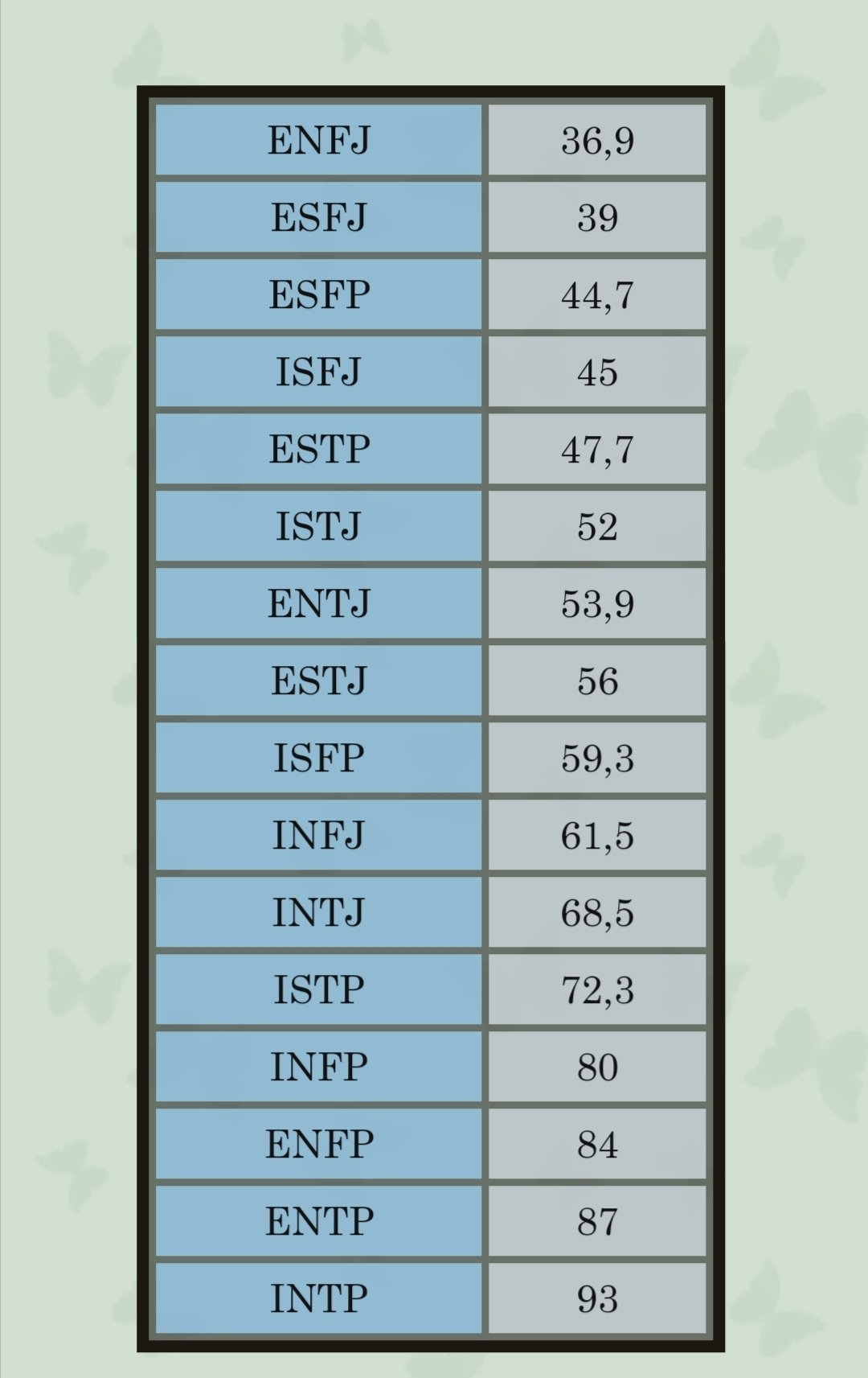 Kheyou, tu sais m'expliquer mes résultats ? Je ne comprends j'ai eu 80 infp pourtant c'est mon 4 ème tandis que certain ont infp en premier avec juste 74
