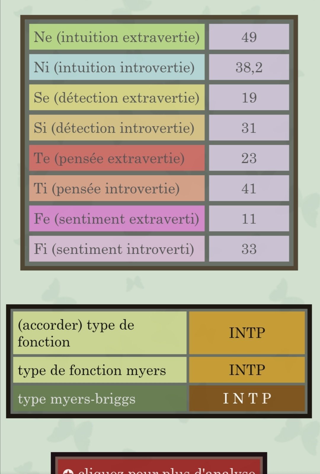 Je vois mais pourquoi il me met INTP en myers briggs si j'ai un T faible ? Et pourquoi j'ai un Ne aussi haut (3eme après Fi et Ni) ?