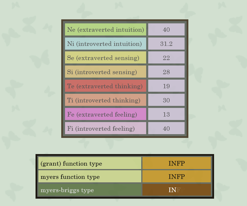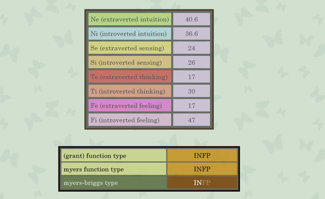 Ben là j'ai plus de Se que de Si, mais il n'empêche qu'en premier Fi à 97% suivi de Ne à 85%, je vois pas comment je peux être plus ISFP que INFP