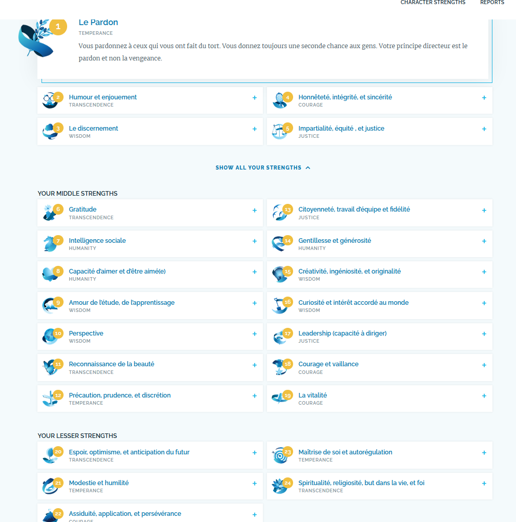 Bon fais le test de VIA character et les 11 premiers sont :