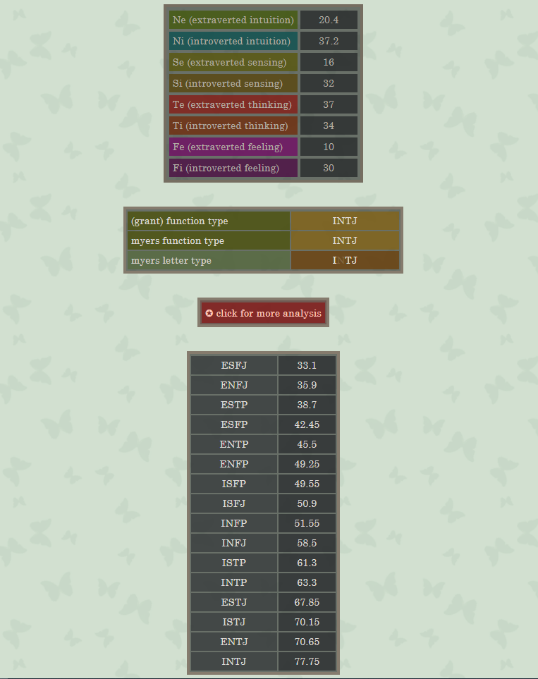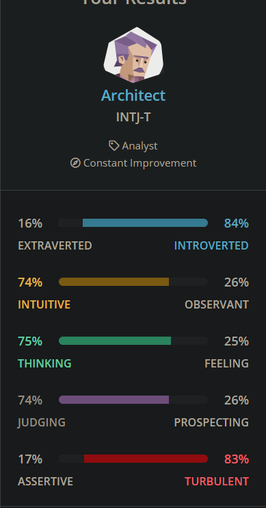 Et l'autre faisant partie du même groupe que moi, le VFEL (l'Arbiter), il y a pas mal d'ISTP 6w5/6w7/7w8 /8w7/8w9 et un peu de 9w8 qui l'ont et c'est un bon match pour moi également dans l'Attitudinal Psyche et possiblement mon Dual si je suis LEFV au lieu de VEFL comme je le pense, décidément