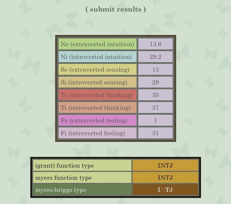 Cela dit, bien que j'ai toujours le résultat INFP, ma fonction Ti est beaucoup plus forte que Te, alors que dans le cas de l'INFP, cela devrait être le contraire...
