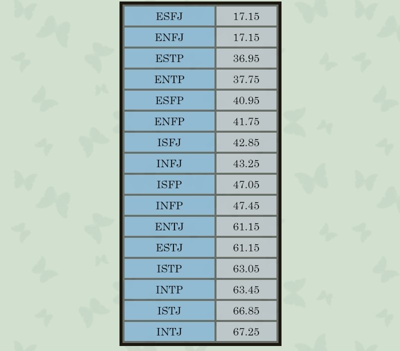 Je suis défenseur, qui est la personnalité la plus répandue dans la population mais bizarrement sur le forum y'en a aucun mais tous les INFP sont sur représentés