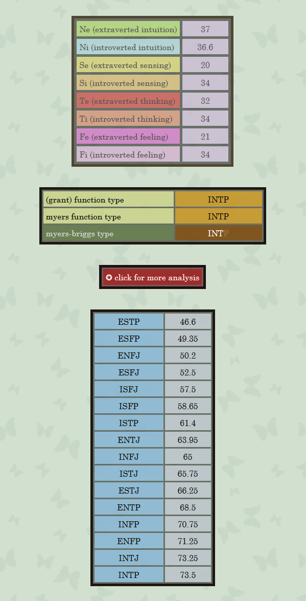 Cela dit, bien que j'ai toujours le résultat INFP, ma fonction Ti est beaucoup plus forte que Te, alors que dans le cas de l'INFP, cela devrait être le contraire...