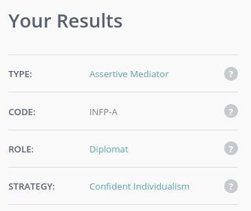 Mais bon je suis beaucoup moins introverti et idéaliste aujourd'hui, je me suis suffisamment casser les dents IRL, j'ai surmonter plusieurs obstacles et me voilà. Mais bon je préférais quand j'étais INFP c'était génial.