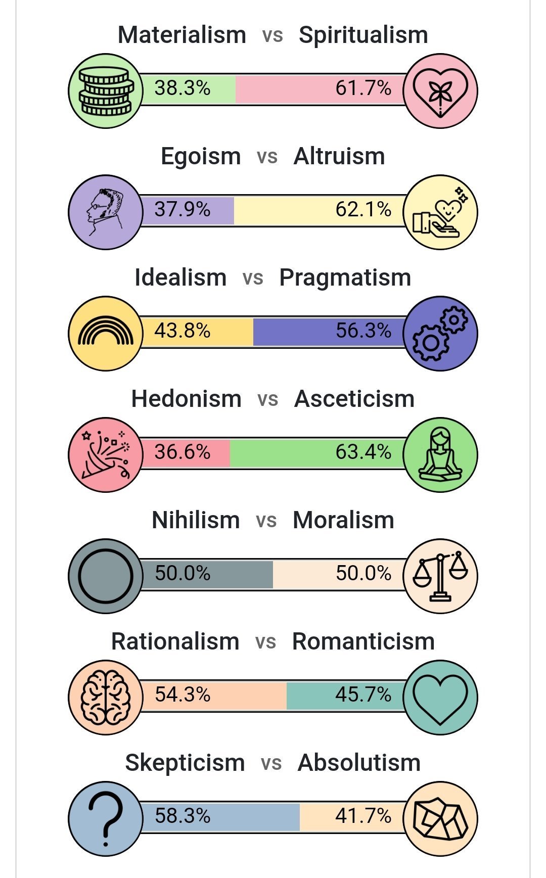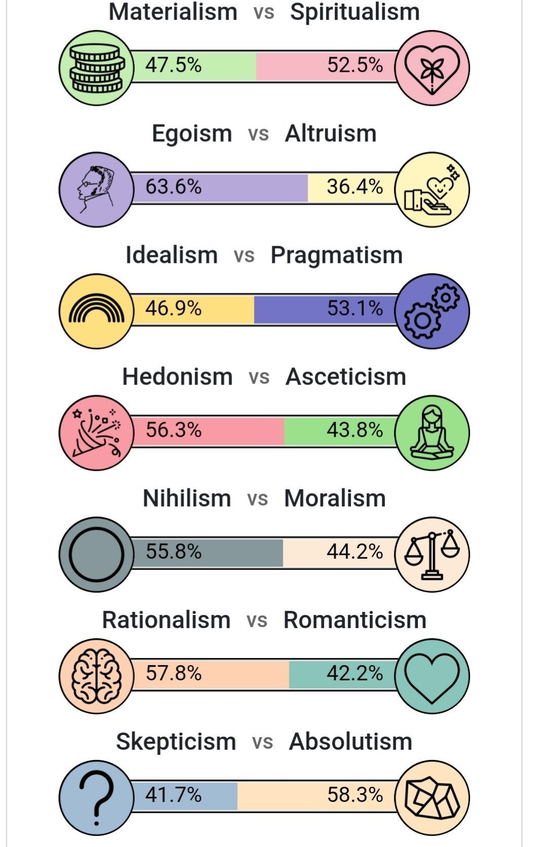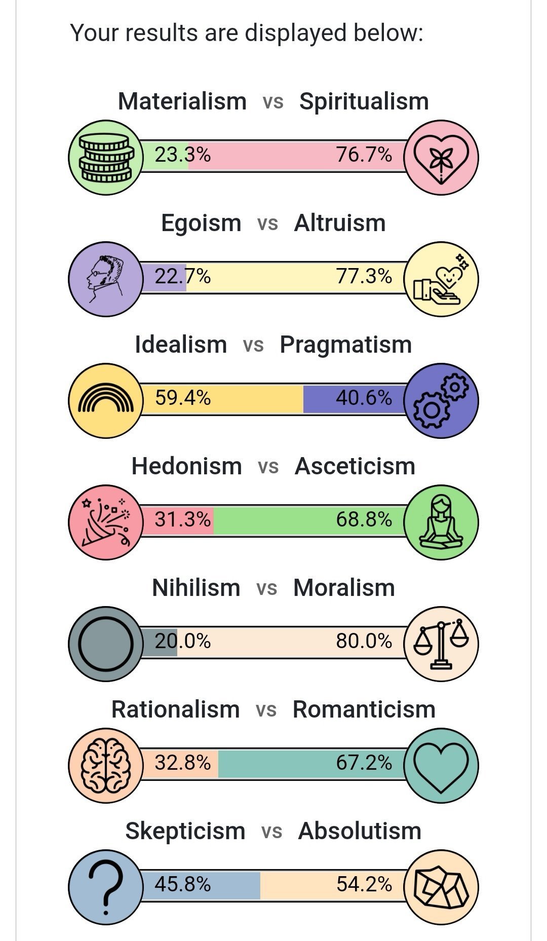 Dans le test, en fait, l'axe pragmatisme / idéalisme ne mesure pas ta personnalité mais ton opinion sur la possibilité d'une société idéale. Je pense pas que c'est une question de personnalité mais plus une question de génération. De de nos jours les gens sont centrés sur eux-mêmes, ne croient en rien et n'ont pas d'idée sur comment améliorer la société ou s'en foutent.