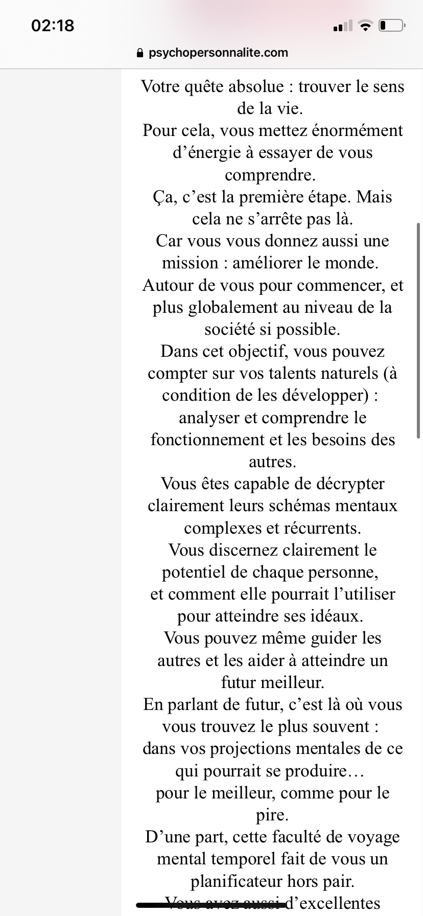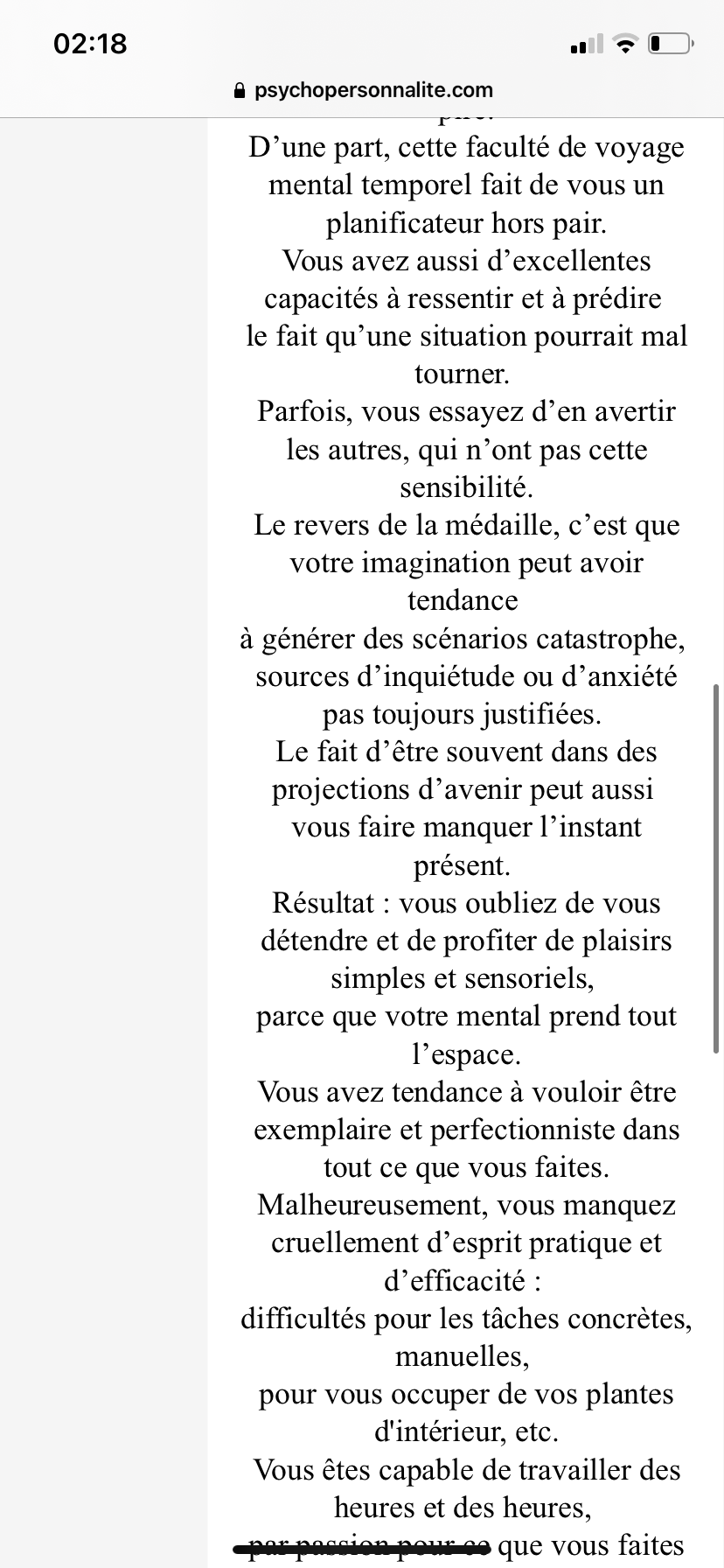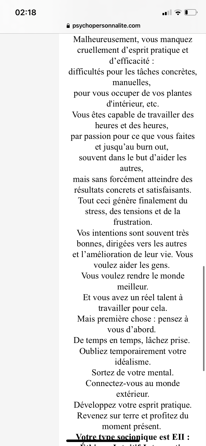 Faut dire que l'auteur a écrit un avis biaisé. Il est lui-même un INFP ayant probablement vécu une mauvaise passe et a probablement mis ses problèmes personnels comme étant problèmes de tous les INFP, ce qui n'est pas le cas. Tu penses te retrouver dans tous les points négatifs de l'INFP par effet barnum mais ta mauvaise estime de toi-même t'empêche de voir tes qualités
