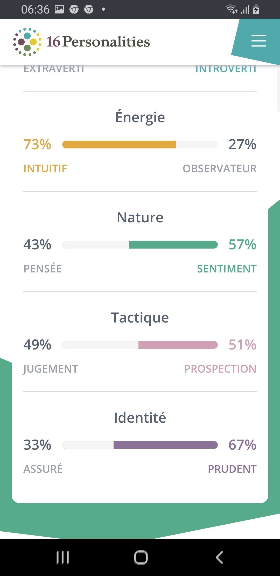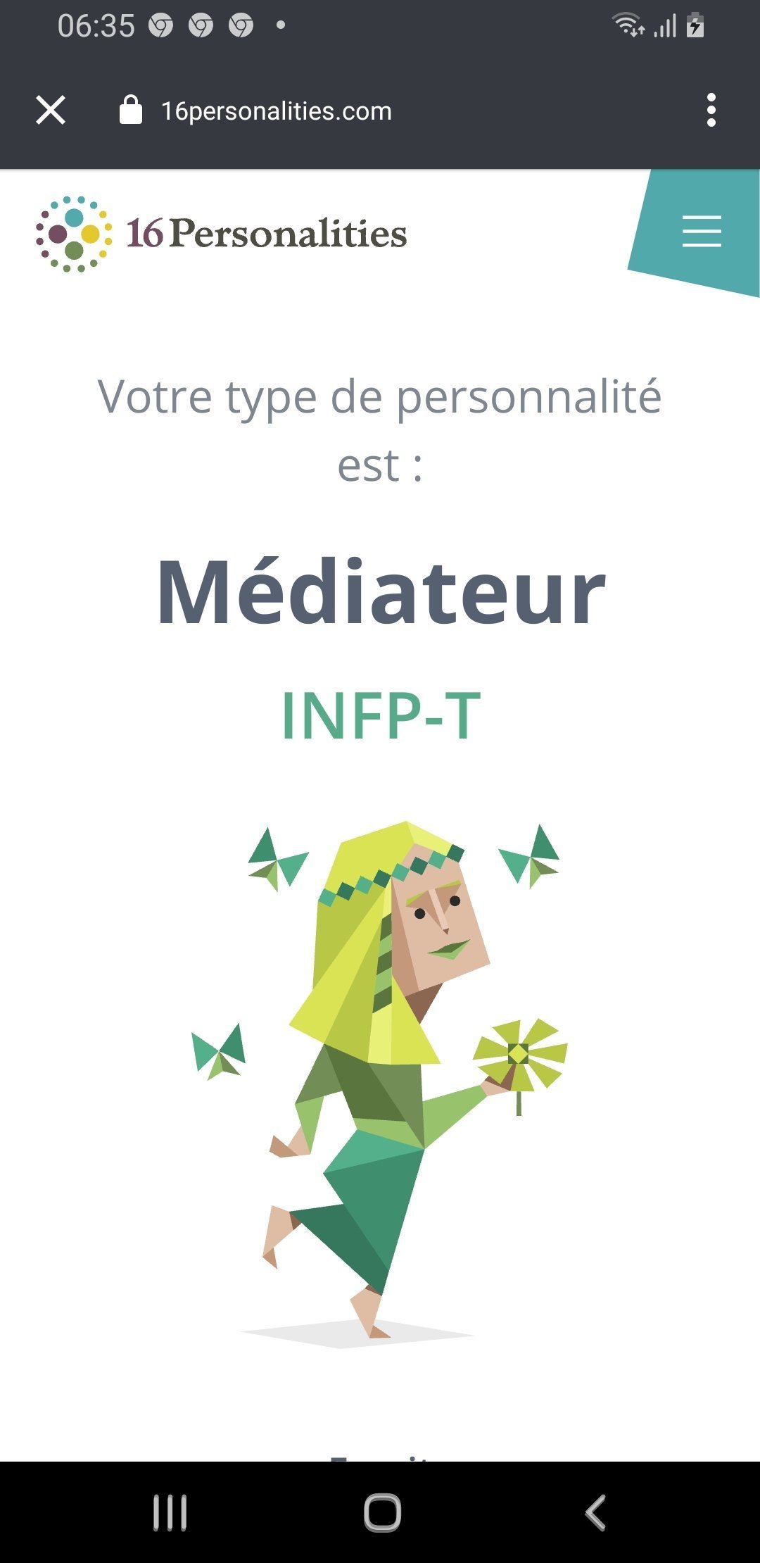 Je sais pas si y a des kheys qui typent un peu, mais ça va faire genre 5 ans que je fais le test 16personalities, et ça change relativement souvent. Grosse dominante ENxP, avec F 4 fois sur 5, et j'ai eu une fois INFP. Le dernier en date me met F à 51% (c'est souvent ce qui ressort).Ma compréhension du truc est que c'est assez logique, que je suis soumis aux changements d'humeur des ENFPs et plus fortement encore par la dépression maniaque. Je précise que je suis honnête quand je réponds aux questions, sait-on jamais.