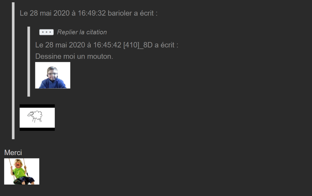 J'avais dessiner un mouton pour un khey, faut que je le retrouveLe 19 juin 2020 à 00:50:35 TchoupiGalaxy a écrit :