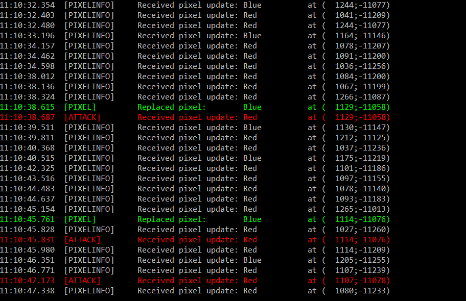 puis tapez PixelPlanetBot.exe run --useMirror --imagePath bleu.png --leftX 980 -d --topY -11377