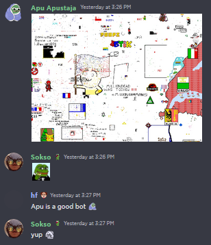 On arrive pas encore a construire la drapeau Français, mais en tout les cas même avec tout ses bots, ses magouilles, son code etc... il arrive pas a se débarrasser de nous, en tout les cas ça fait 3 jours et demi qu'il n'a plus son drapeau nazi tout beau