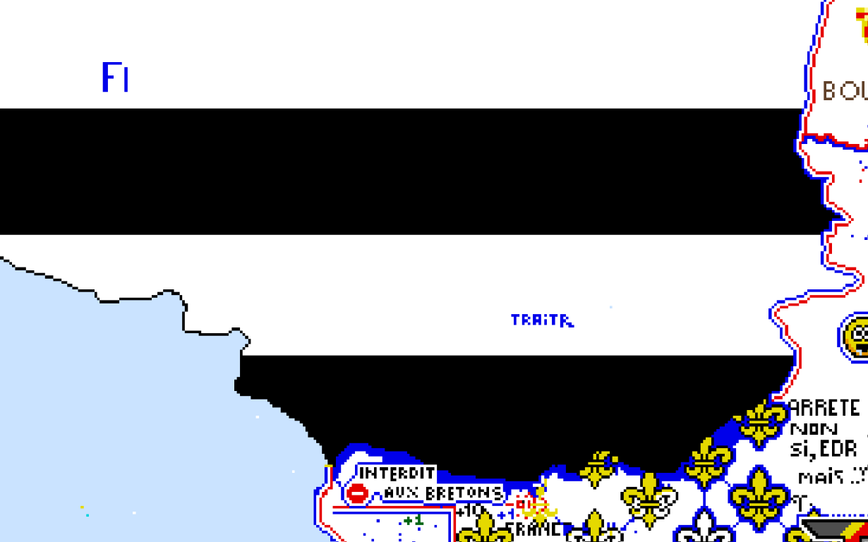Avis aux bretons: on dessine pour l'instant la frontière provisoire coté français, mais elle ne correspond pas vraiment a la frontière actuelle. Quand vous aurez finis votre drapeau sur l’échelle régionale, je vous proposerais de vous étendre si besoin mais en remettant bien la frontière bleu blanc rouge au bon endroit.