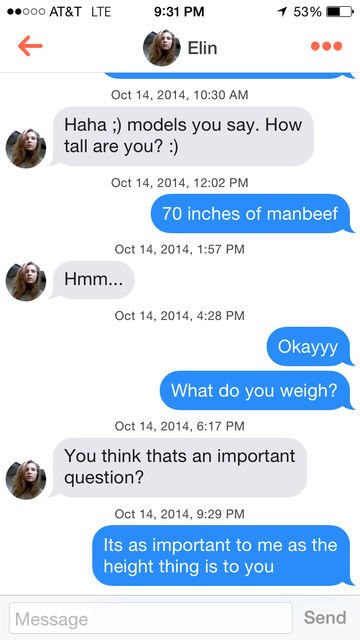 Je fais 1m86 mais dès qu'une meuf me demande quelle taille je fais, je lui demande à mon tour quel poids elle fait. Et elles ont toutes la même réaction, même si elles ne sont pas grosses.