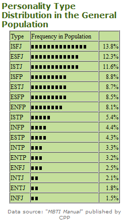Le problème c'est que les sondages sont objectivement biaisés par le fait que les gens utilisent 16p pour se typer, qui est lui meme biaisé. Je pensais être ENFP pendant un certain temps par exemple et pourtant je le suis pas.