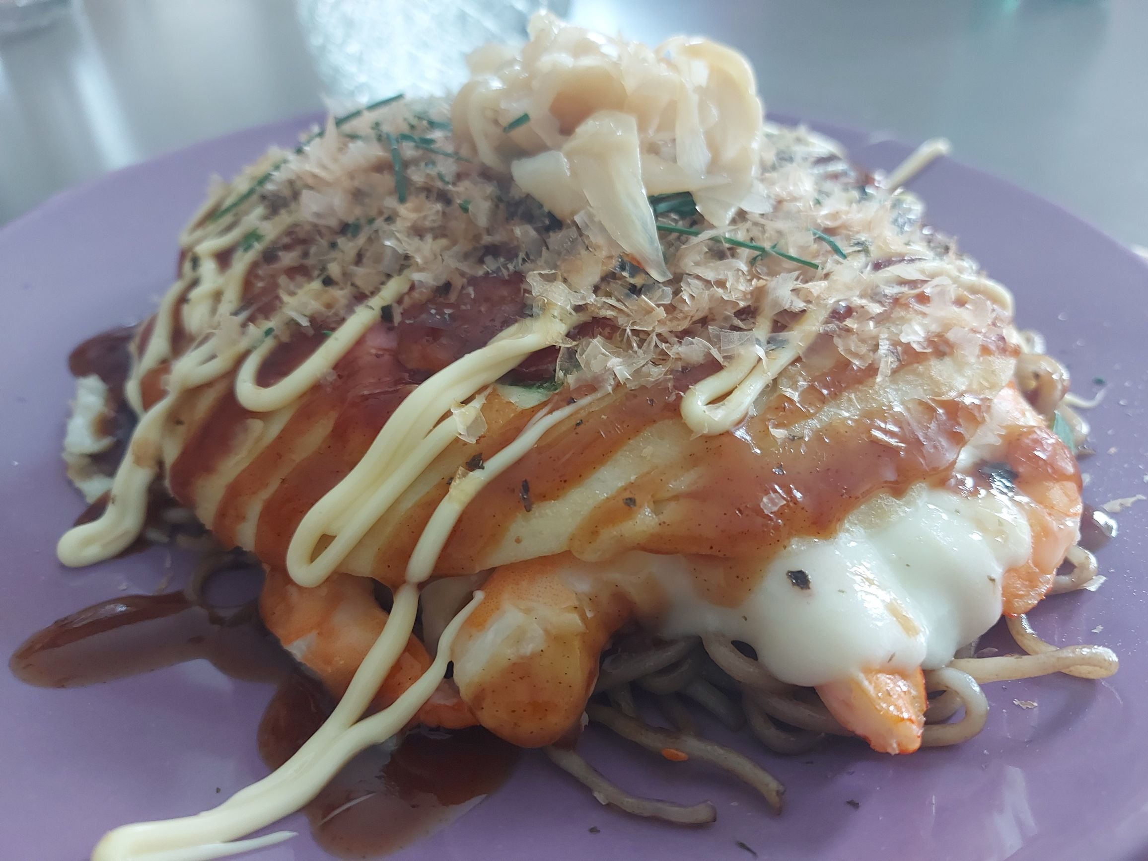 Ensuite du chou des oeufs , des pates, des crevettes, du bacon et quelques toping et une sauce okonomiyaki. Tu peux commander les produits Japonais sur une épicerie en ligne