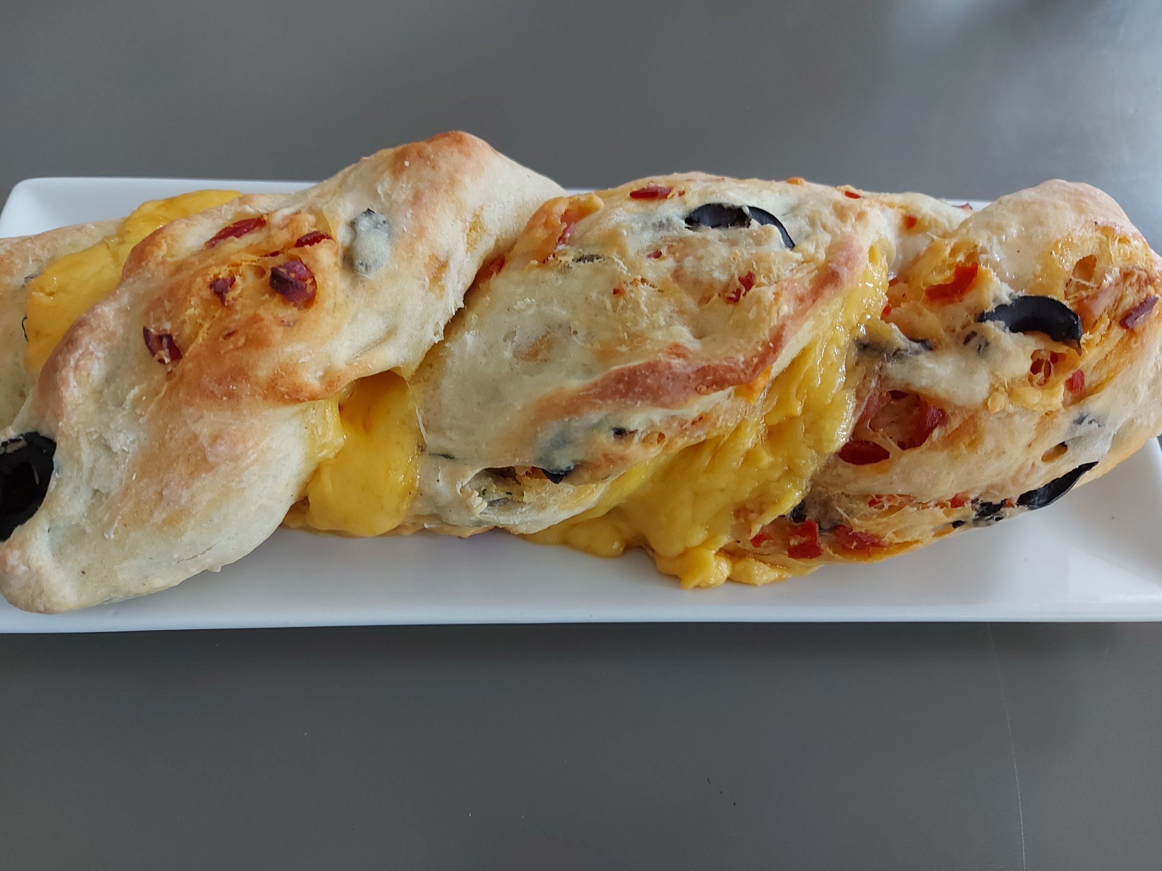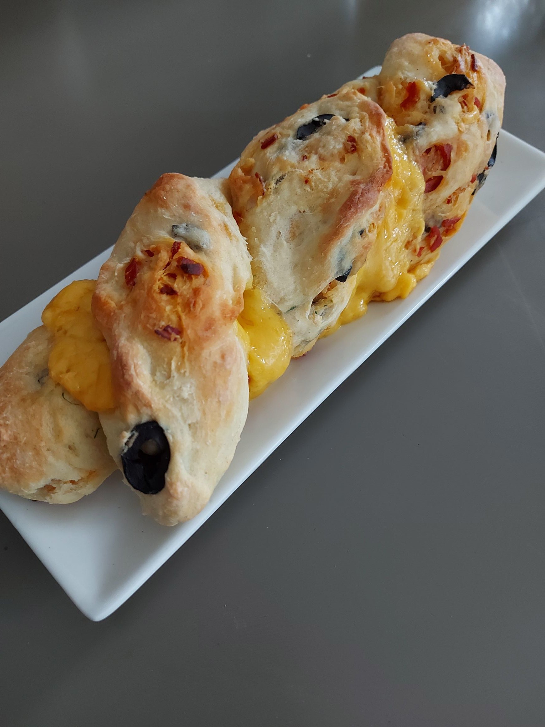 du coup j'étais fatigué, je me suis pas trop cassé la tête pour ce soir j'ai fait une fougasse maison avec chorizo, olives noires, herbes fraîches et éclats de chedar