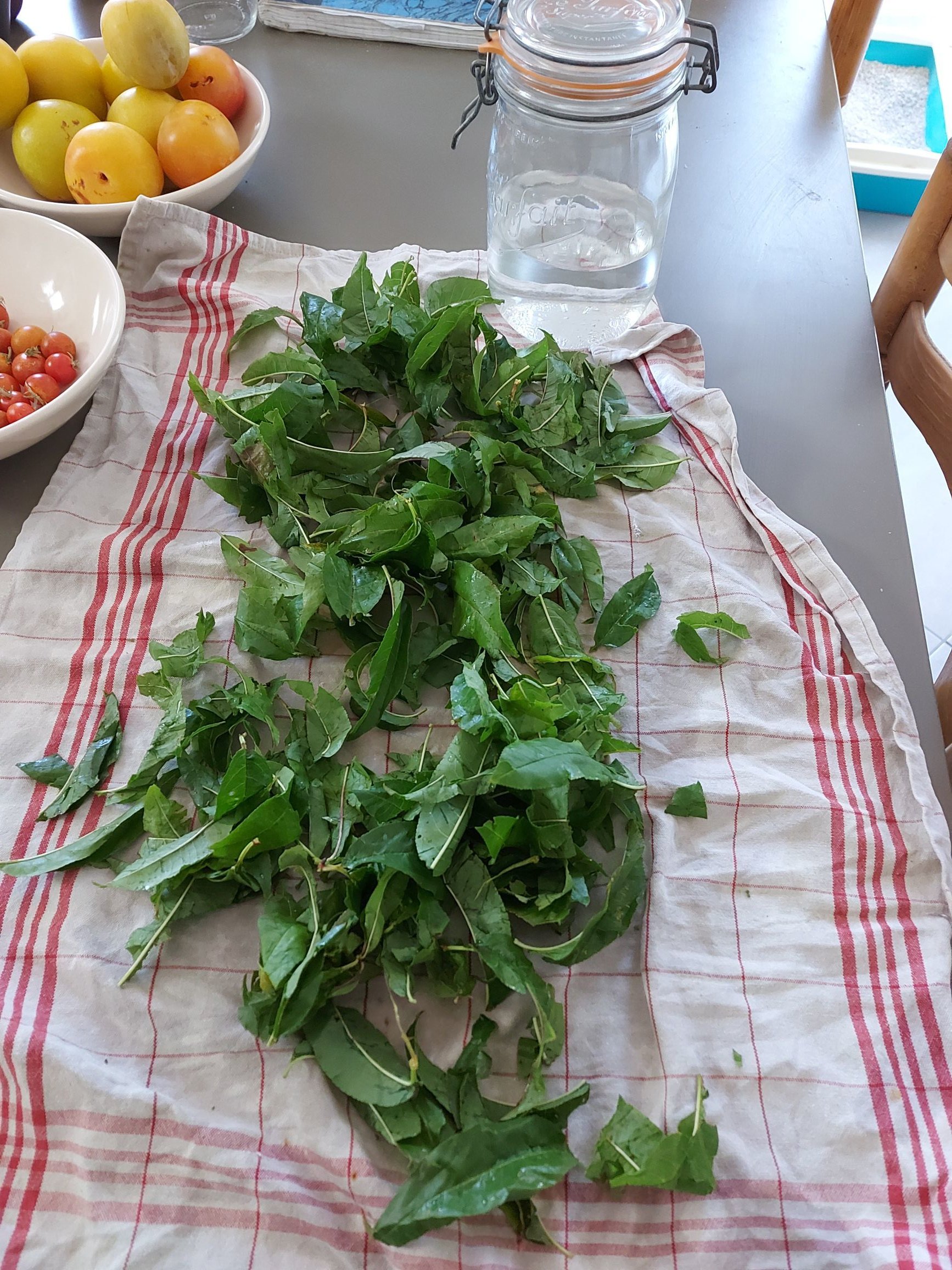 Je vais chercher 125 feuilles de pêcher au verger. Le mieux est de le faire en Août, c'est là où les feuilles sont les meilleures
