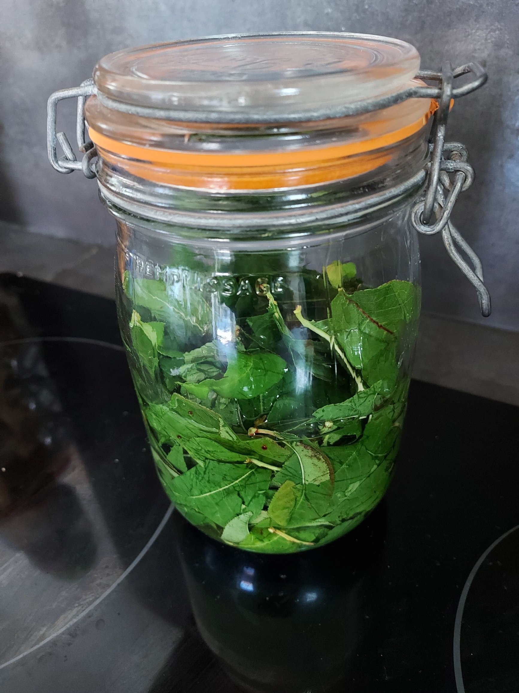 Puis on met 70cl d'alcool pour fruits a 40% dans un pot. On ajoute les feuilles et on stock dans le noir pendant 40 jours