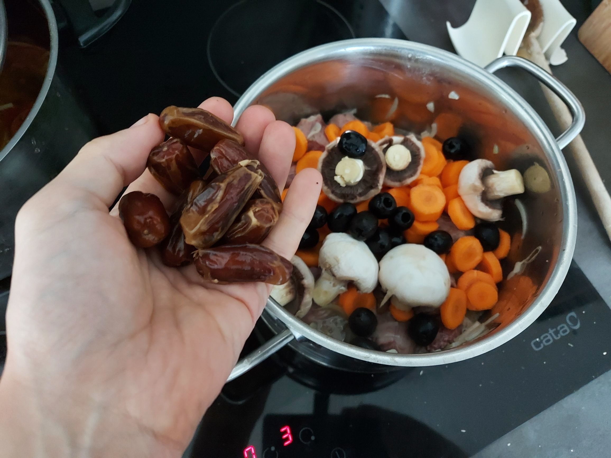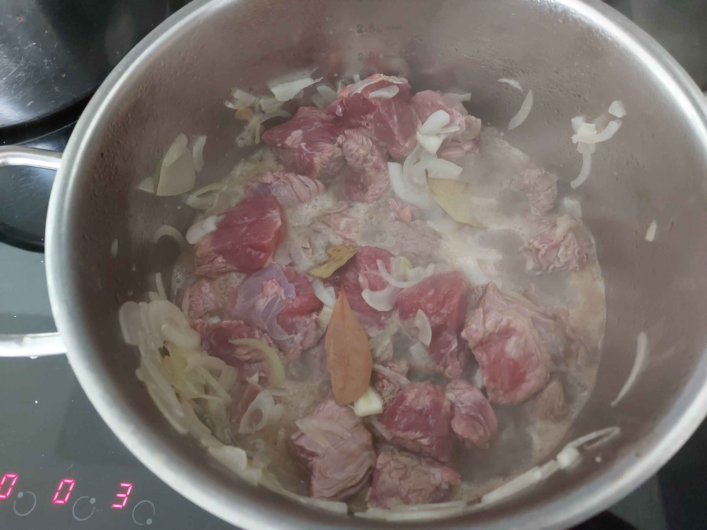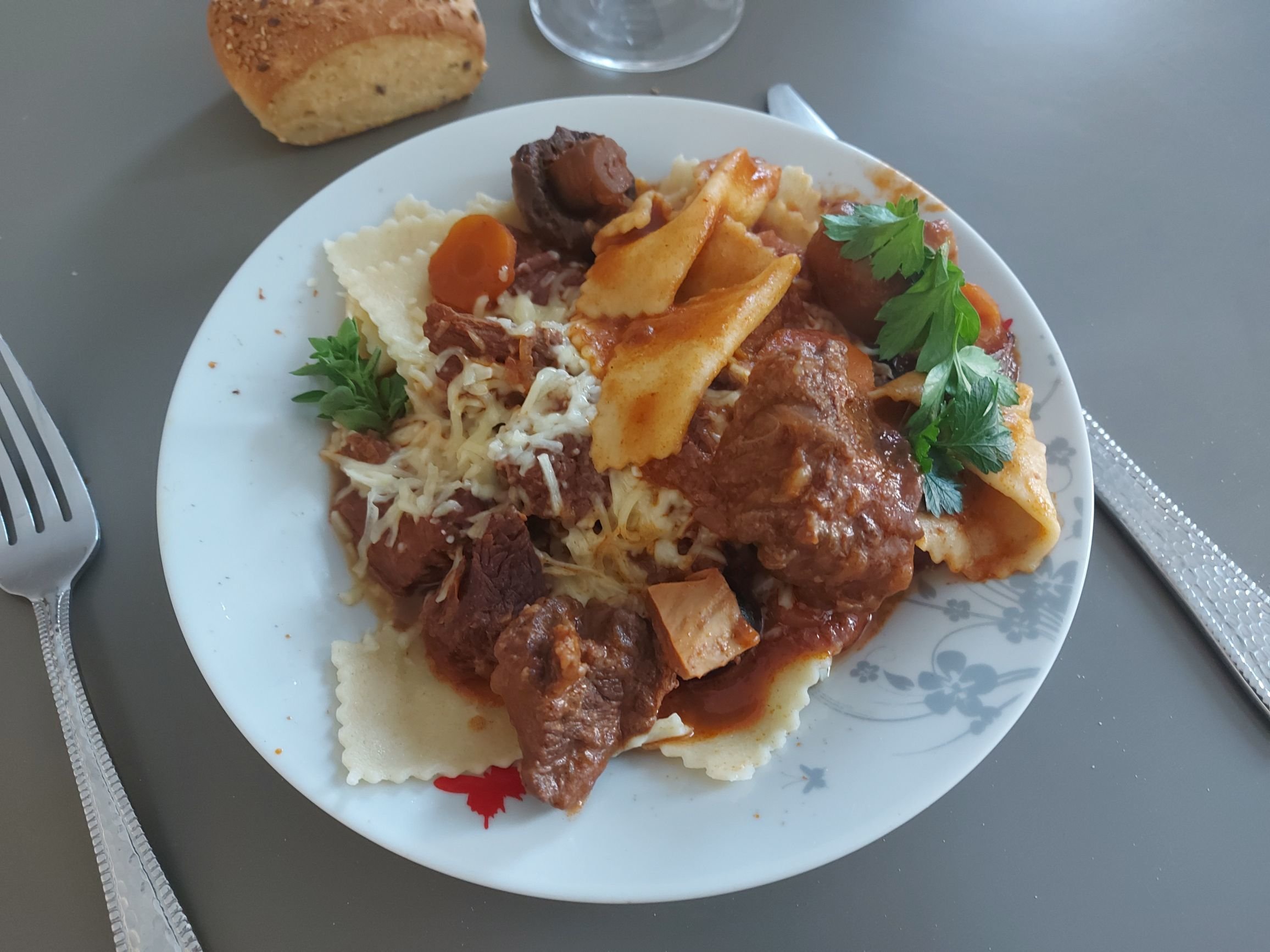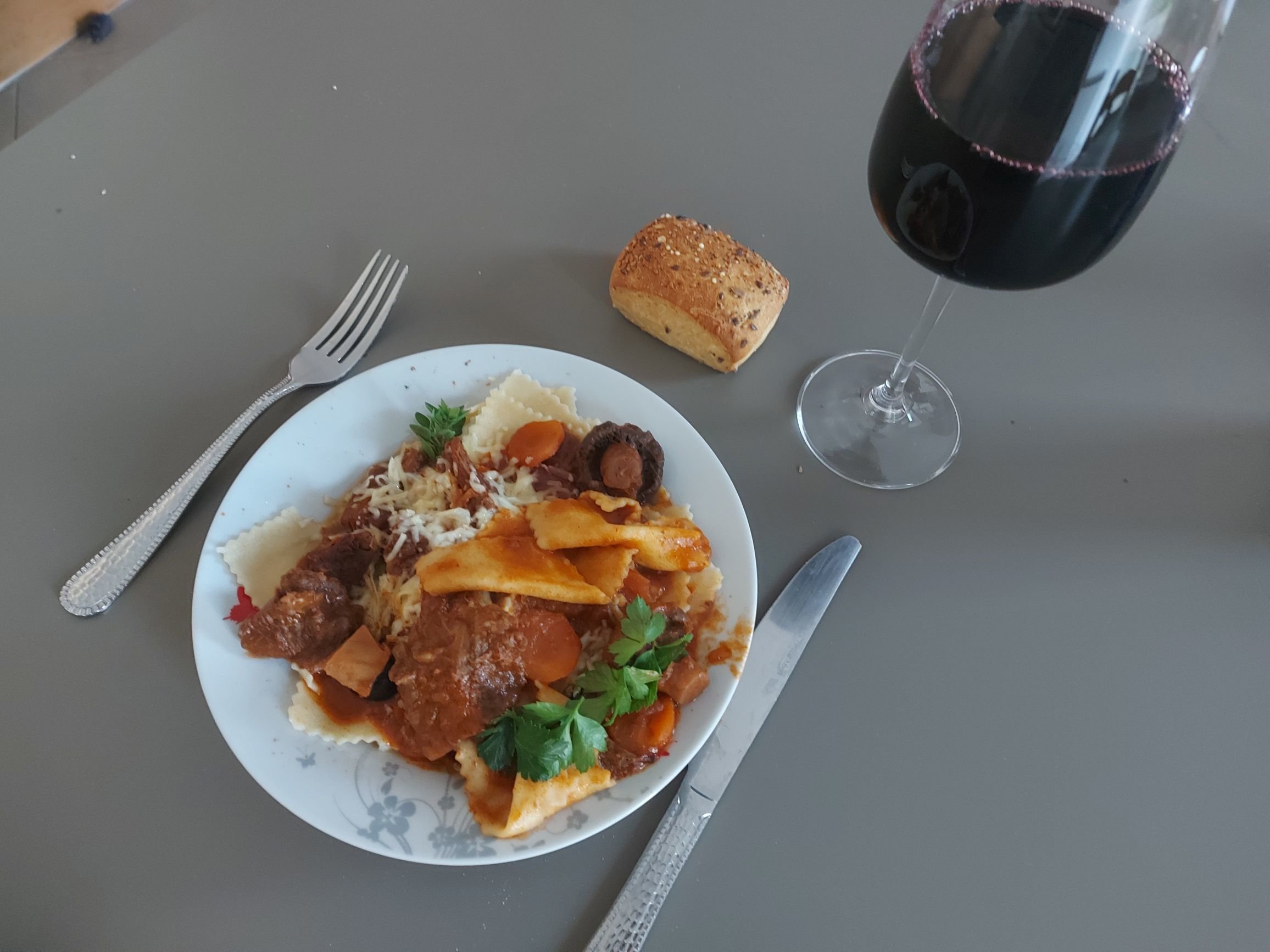 J'ai réalisé un ragoût de bœuf en mijoté 6 heures de cuisson dans des herbes de montagne (que j'ai ramassé à côté de chez moi), sauce au vin et tomates, cèpes, champignons de Paris, oignons, ail, carottes.