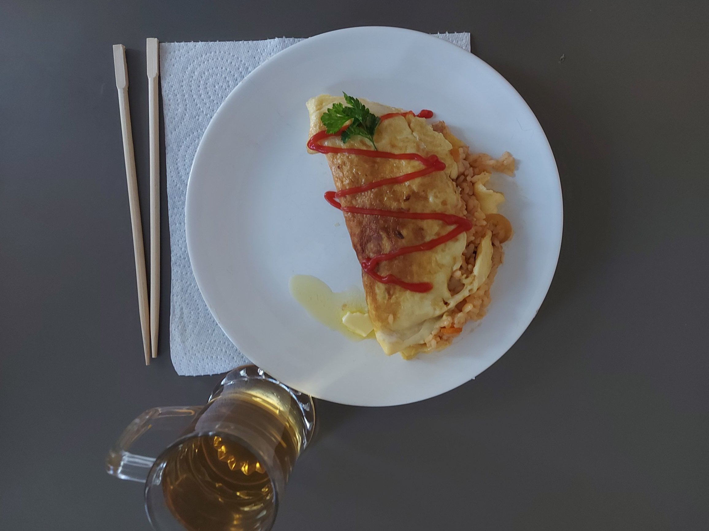 Une omelette fourée de riz , poulet, oignons (j'ai aussi mis une carotte) le tout cuit dans une sauce japonaise au ketchoupe !