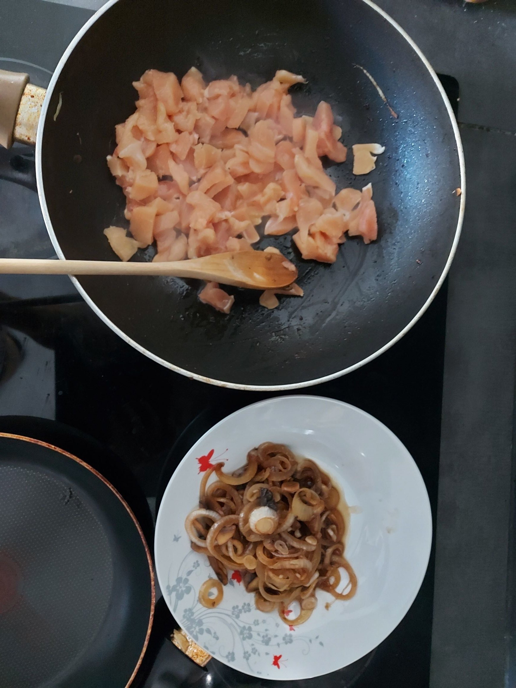 Faîtes cuir les Dès de poulet dans l'huile. Quand les morceaux sont dorés, ajoutez l'oignon et les champignons. Faites cuir à feu doux en remuant de temps en temps.