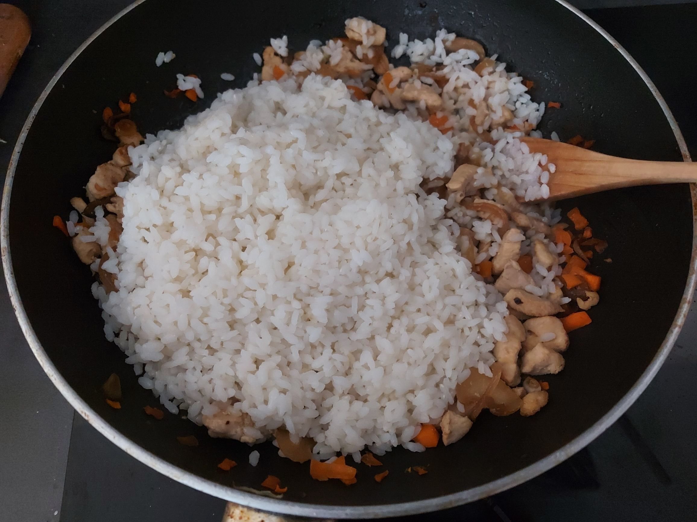 Retirez l'eau éventuellement restante dans le riz et ajoutez le riz egouté dans la préparation avec la viande, les carottes, oignons, champignons...