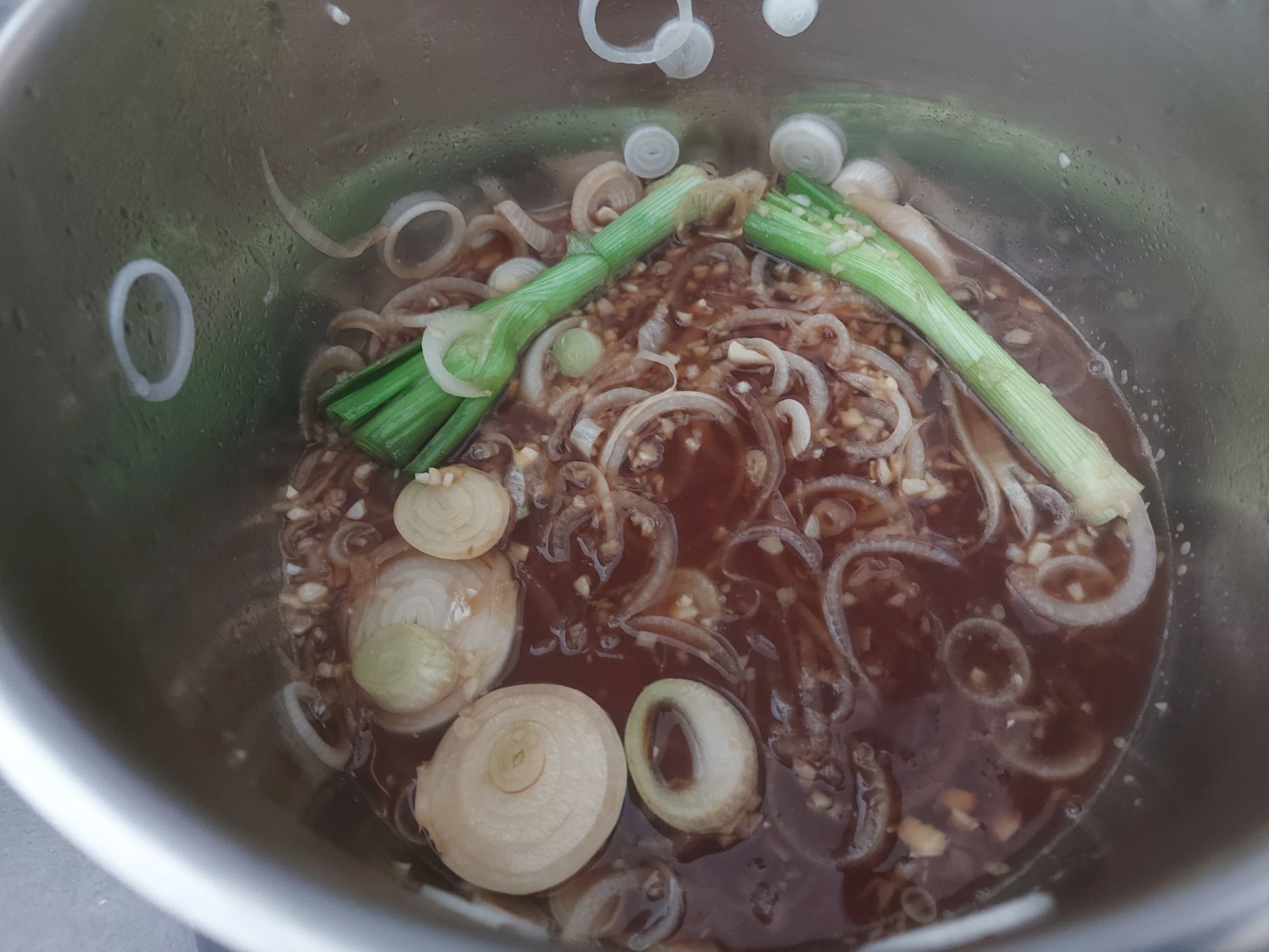 Puis, petit à petit j'ai ajouté les oignons du jardin, de l'ail, du gingembre frais, de la sauce soja, un peu de saké, de l'eau et une cuillère à café de sucre roux.