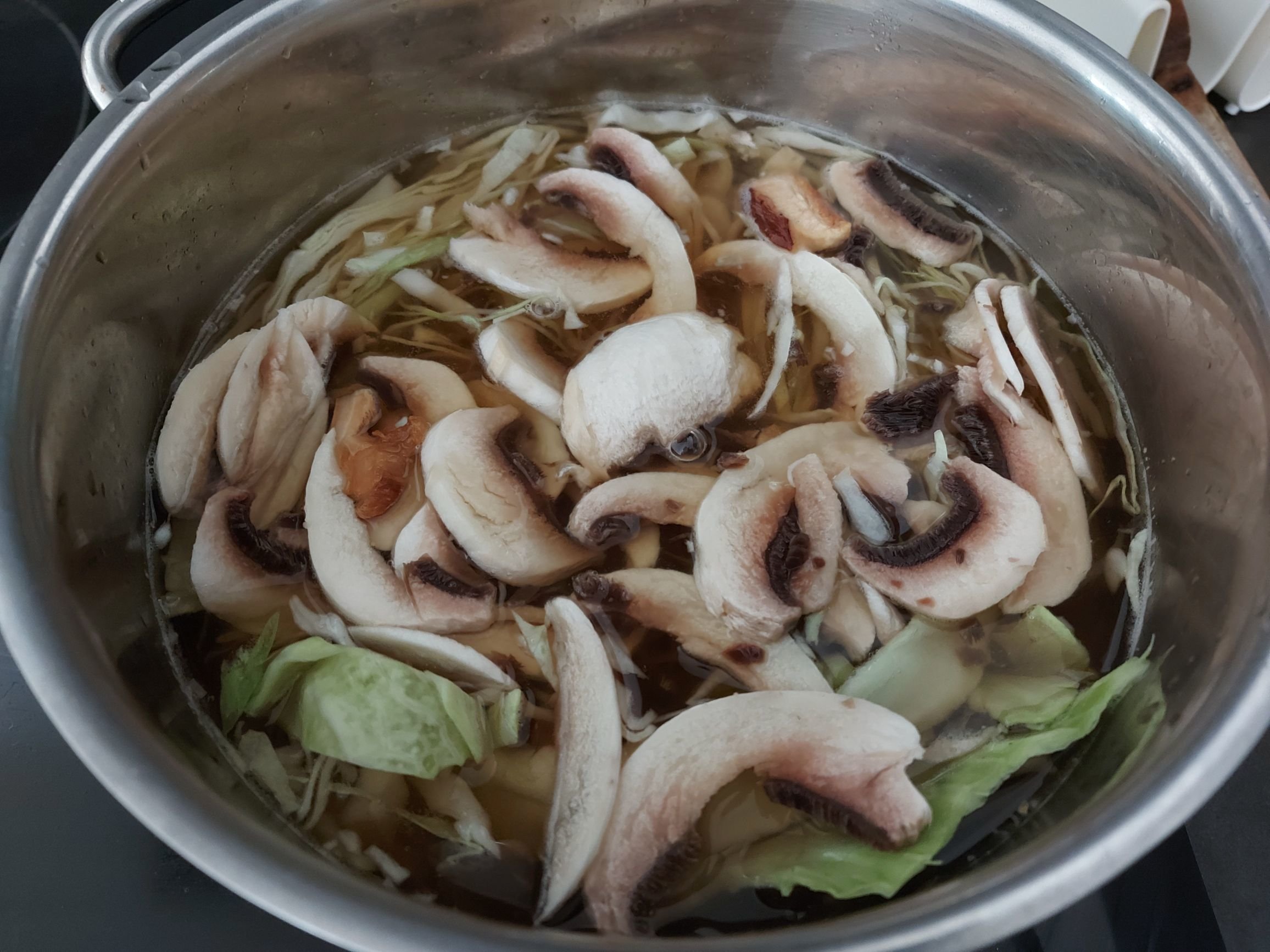 J'ai ajouté le chou très finement coupé, des shiitakés, et des champignons de Paris. A ce moment on laisse mijoter une bonne heure après avoir ajouté un litre d'eau