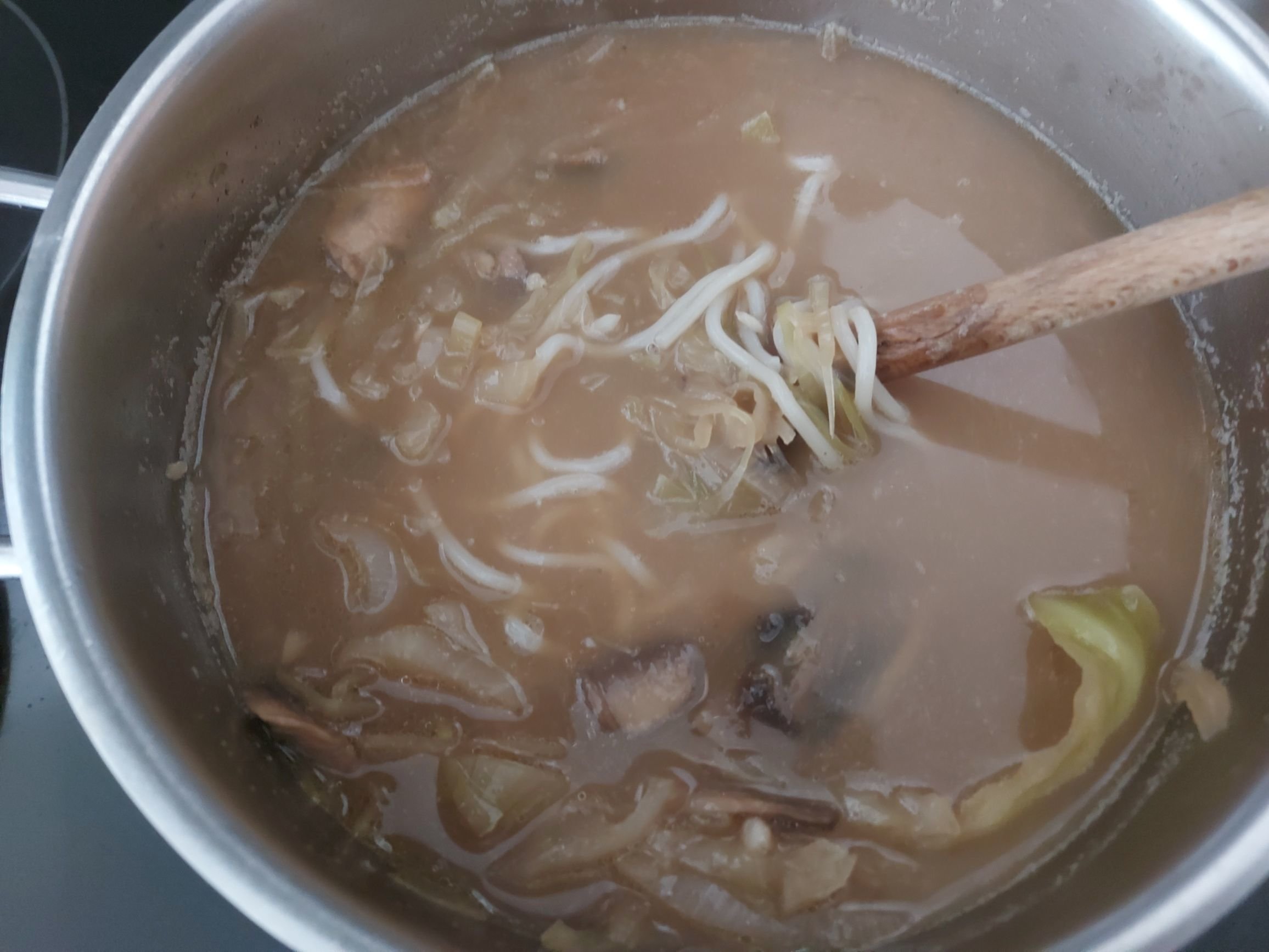 J'ai ajouté les nouilles fraîches au bouillon. On remarque qu'il est devenu légèrement blanc grâce au os de viande.