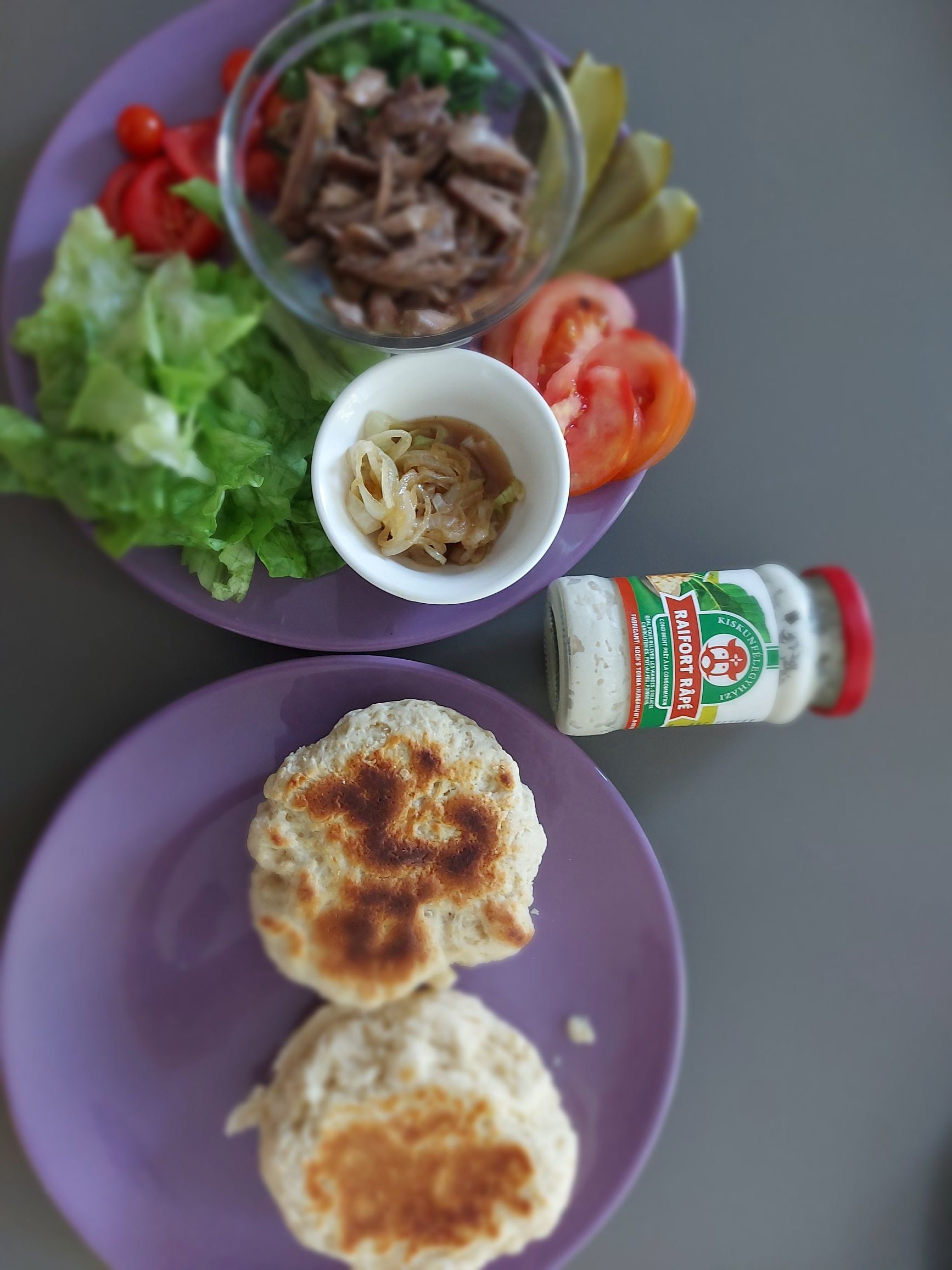 J'ai garni le tout d'effiloché de bœuf mariné, de crudités, une sauce au réfort... de la simplicité ! J'ai ajouté quelques frites maison en accompagnement.