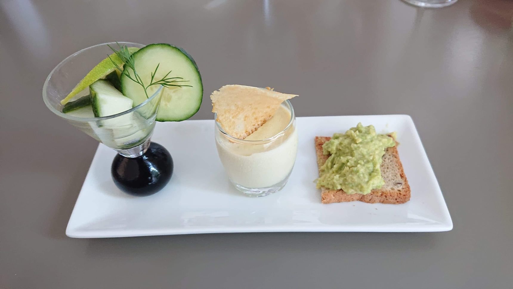 Verrines, concombres vodka citron, panacota d'asperges et tuile au fromage, toast guacamole