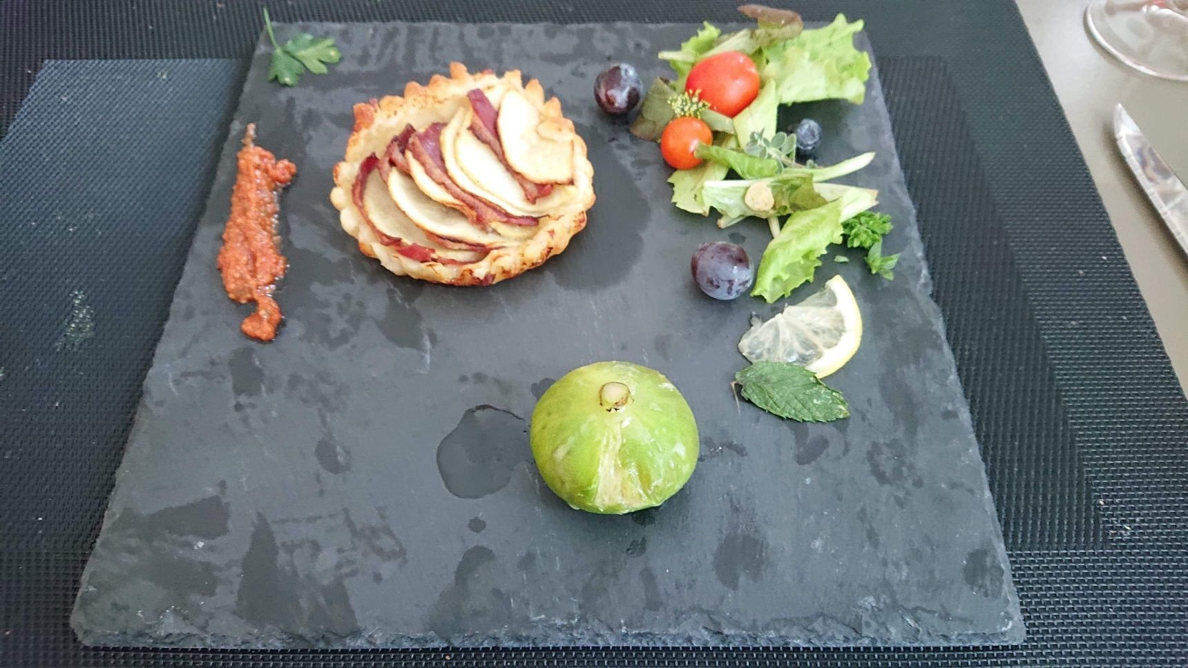 Tartelette au canard et aux pommes , figue caramélisée, salade et Caviar de tomates